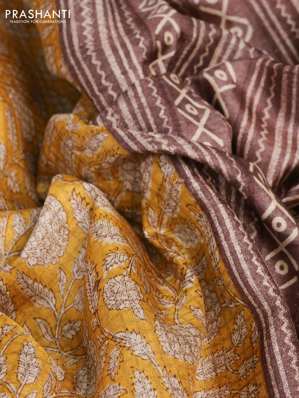Pure tussar silk saree mustard yellow with allover kalamkari prints and printed border