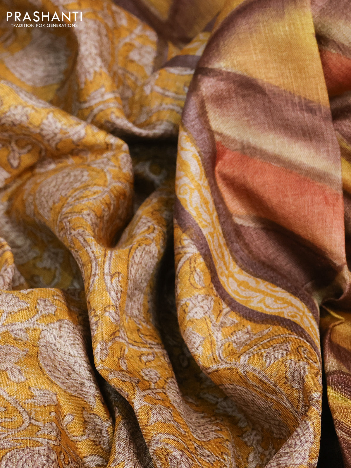 Pure tussar silk saree mustard yellow with allover kalamkari prints and printed border