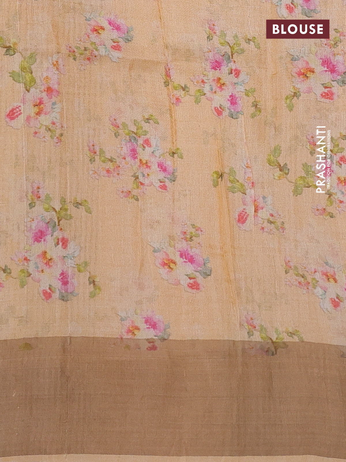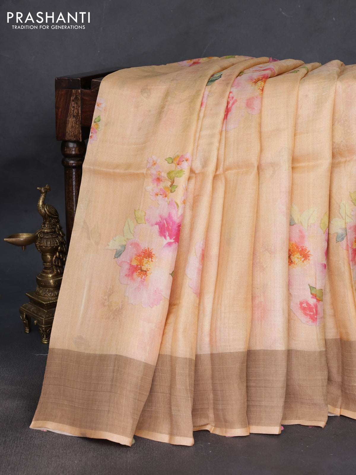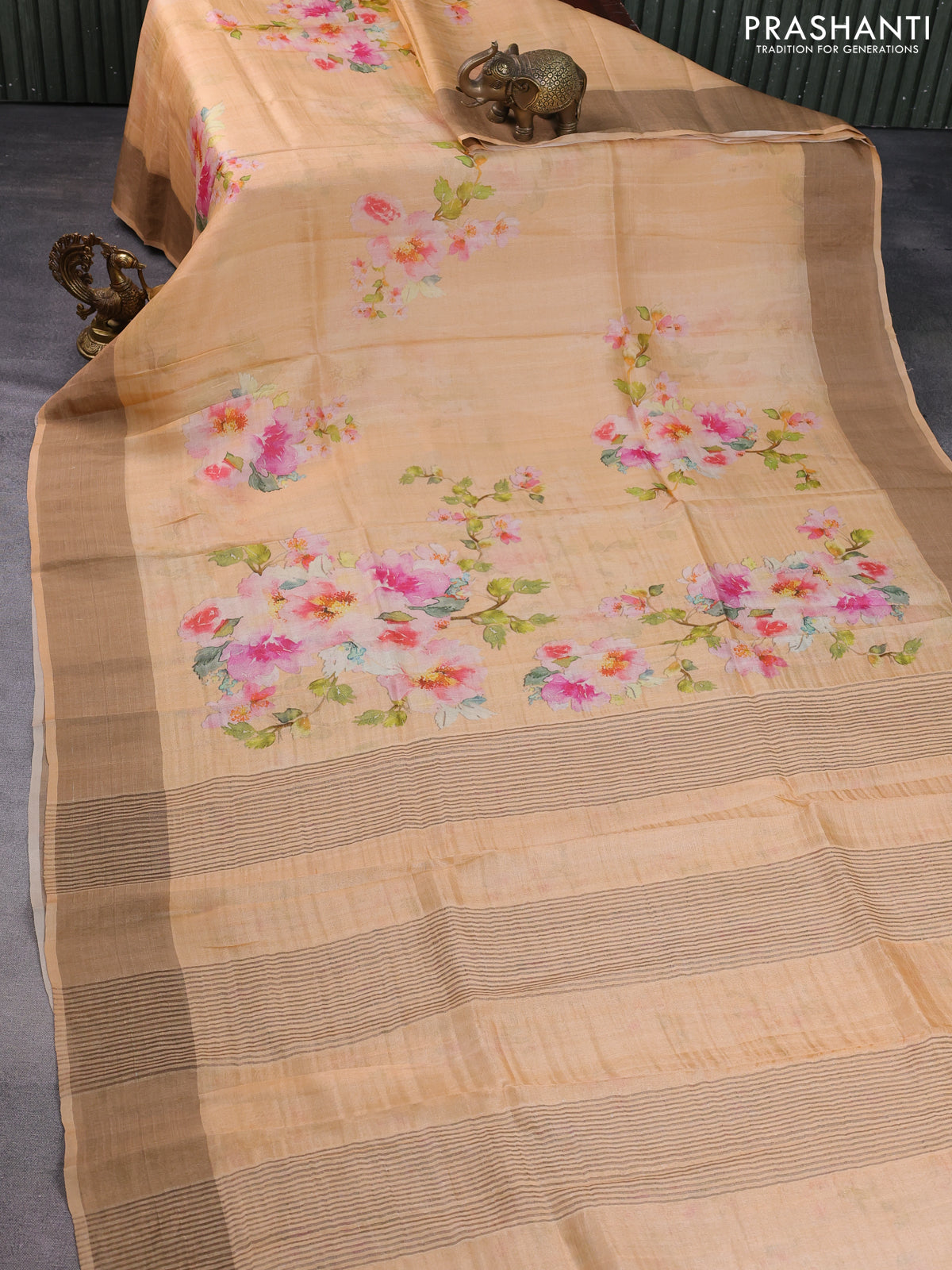 Pure tussar silk saree pale orange with floral digital prints and zari woven border