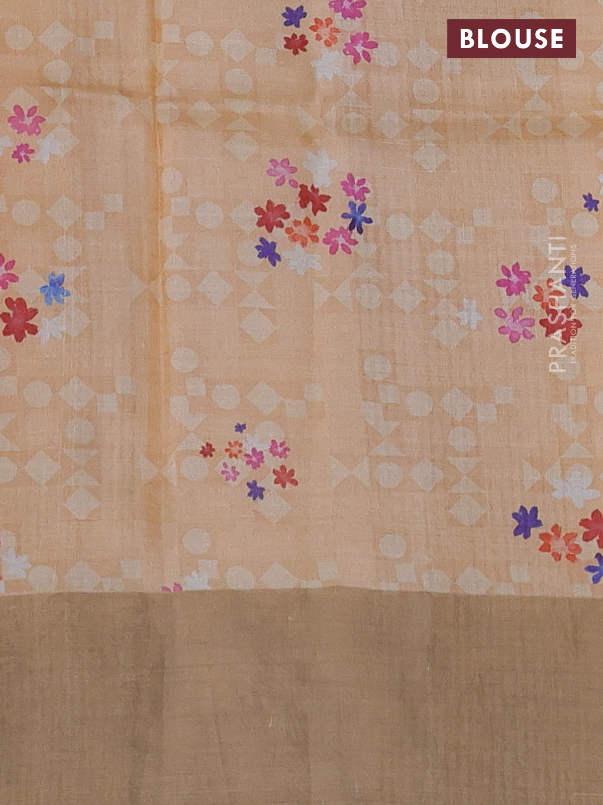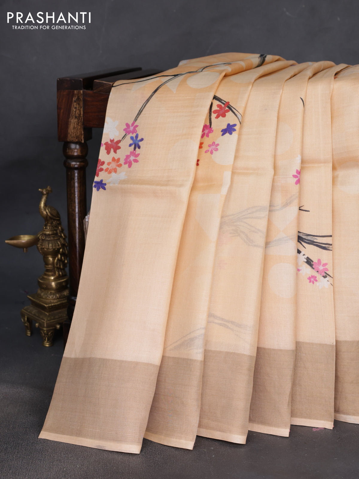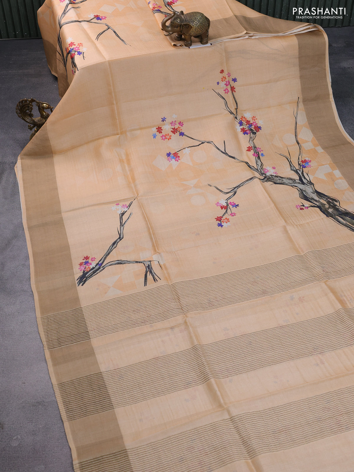 Pure tussar silk saree pale orange with floral digital prints and zari woven border