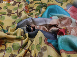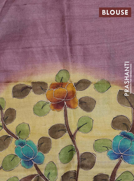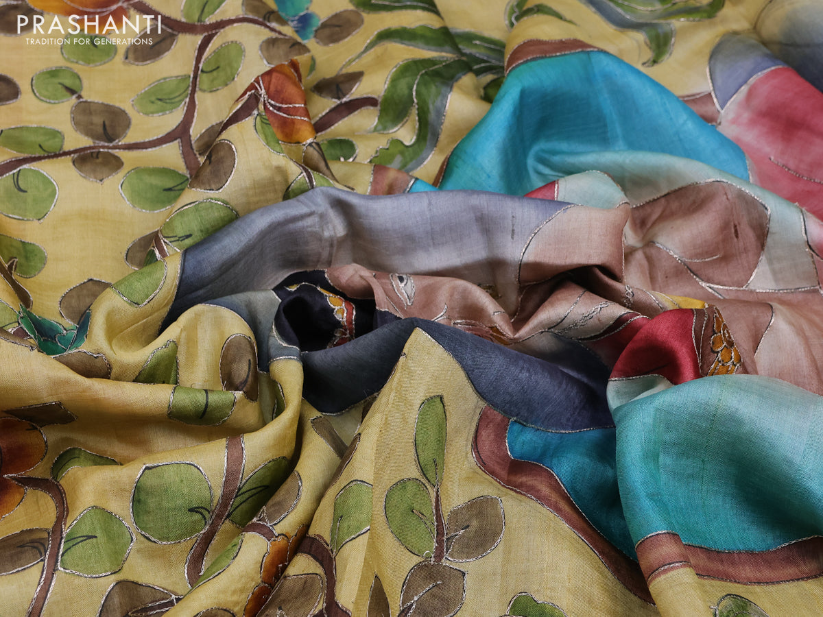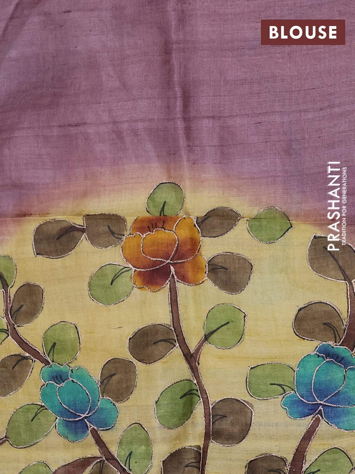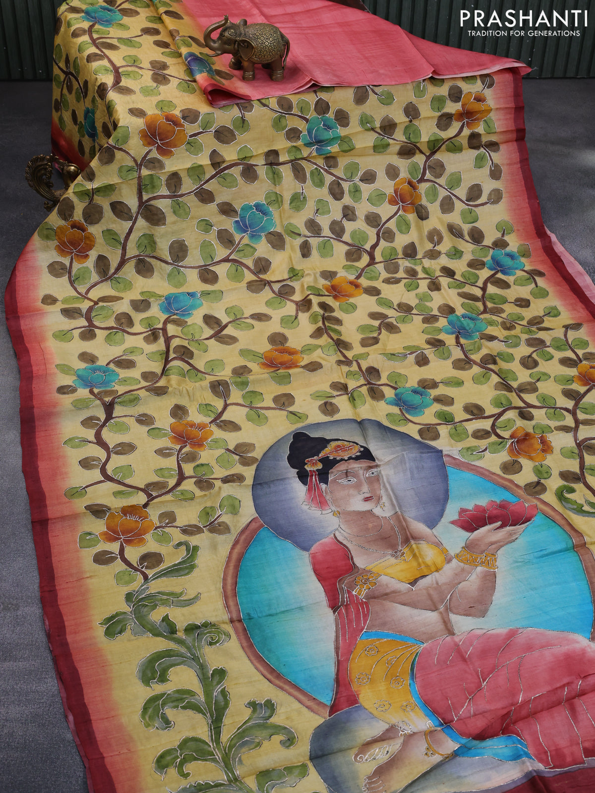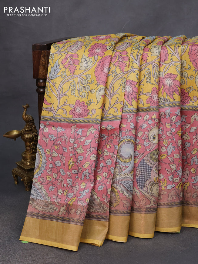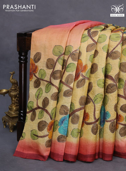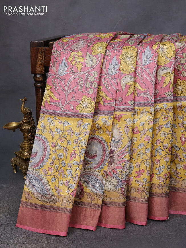 Pure tussar silk saree pale yellow and peach pink with allover embroidery work & kalamkari prints and simple border