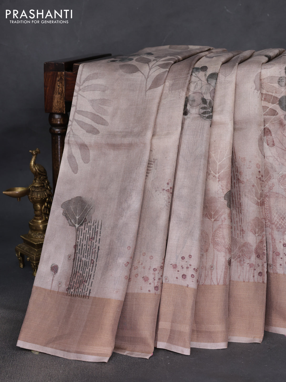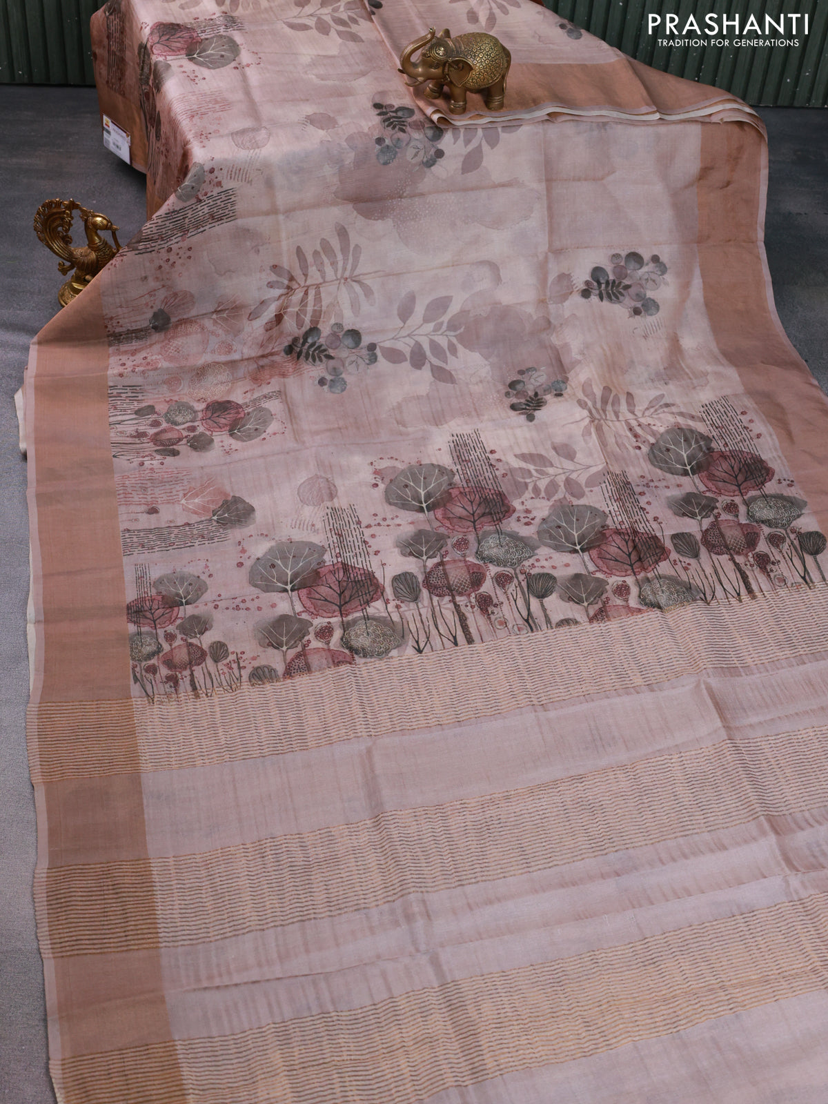 Pure tussar silk saree pastel brown with digital prints and zari woven border