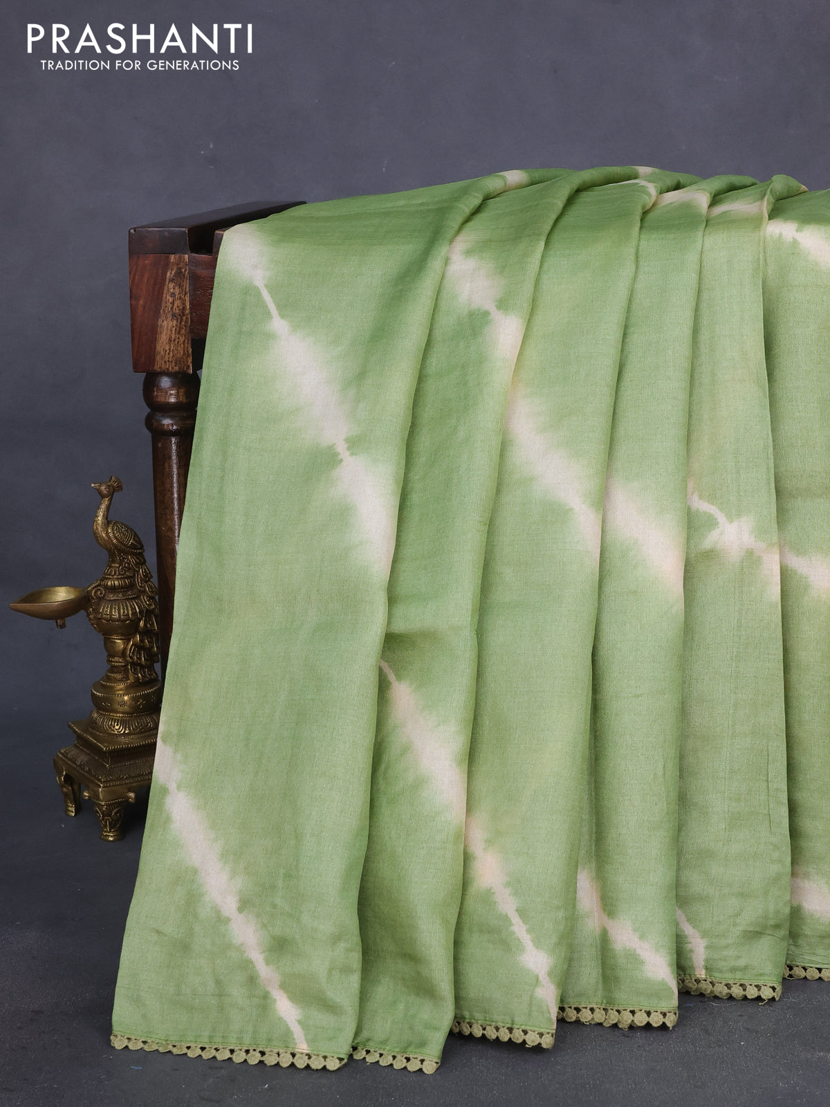 Pure tussar silk saree pastel green and rust shade with allover tie & dye prints and kalamkari prints & cut work pallu