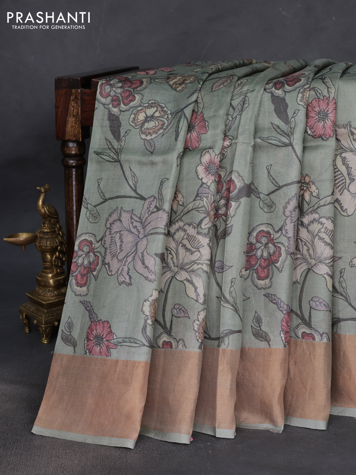 Pure tussar silk saree pastel green with allover floral digital prints and zari woven border