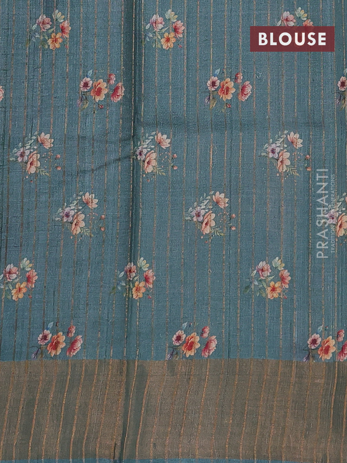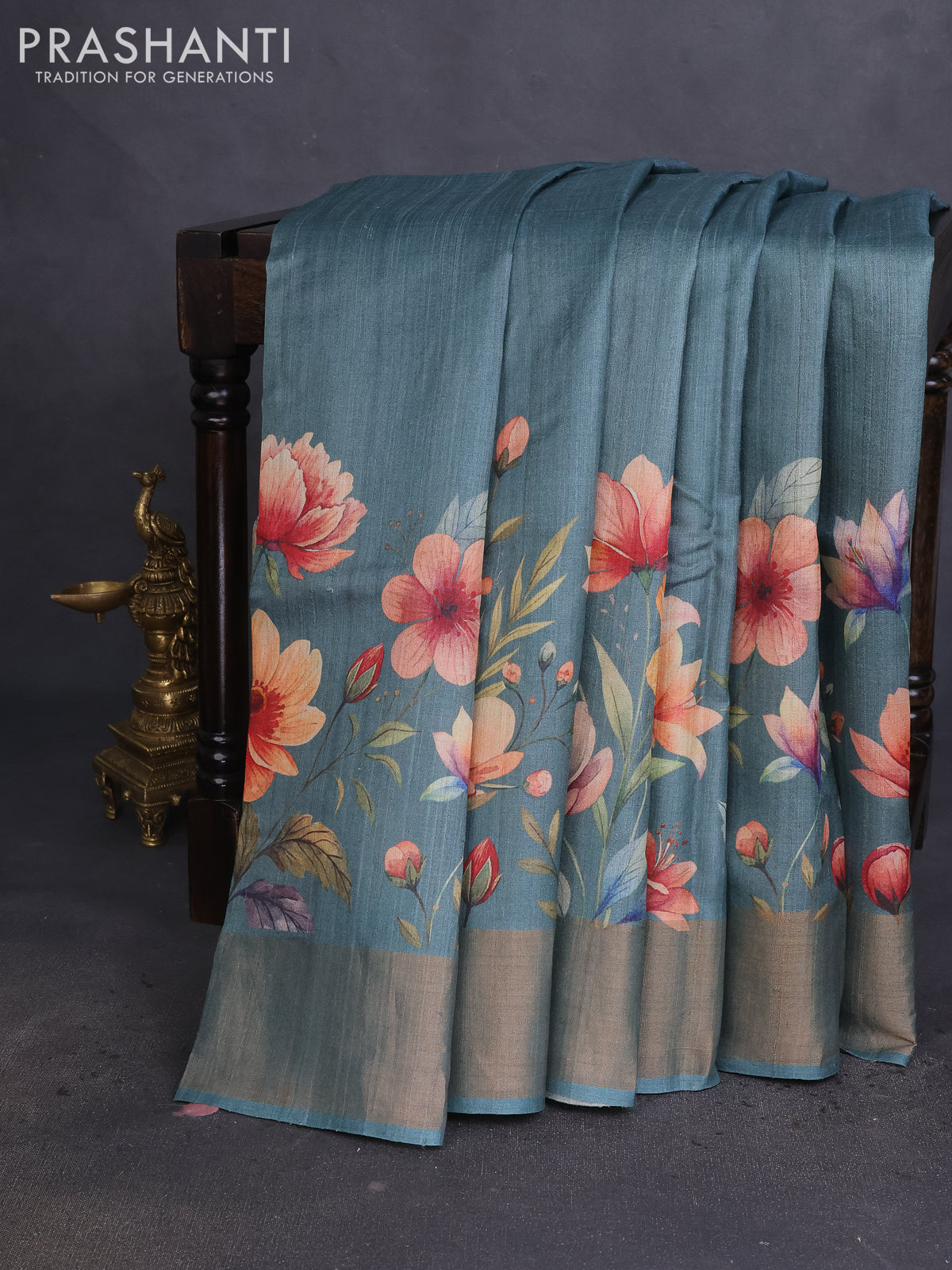 Pure tussar silk saree pastel green with floral digital prints and zari woven border