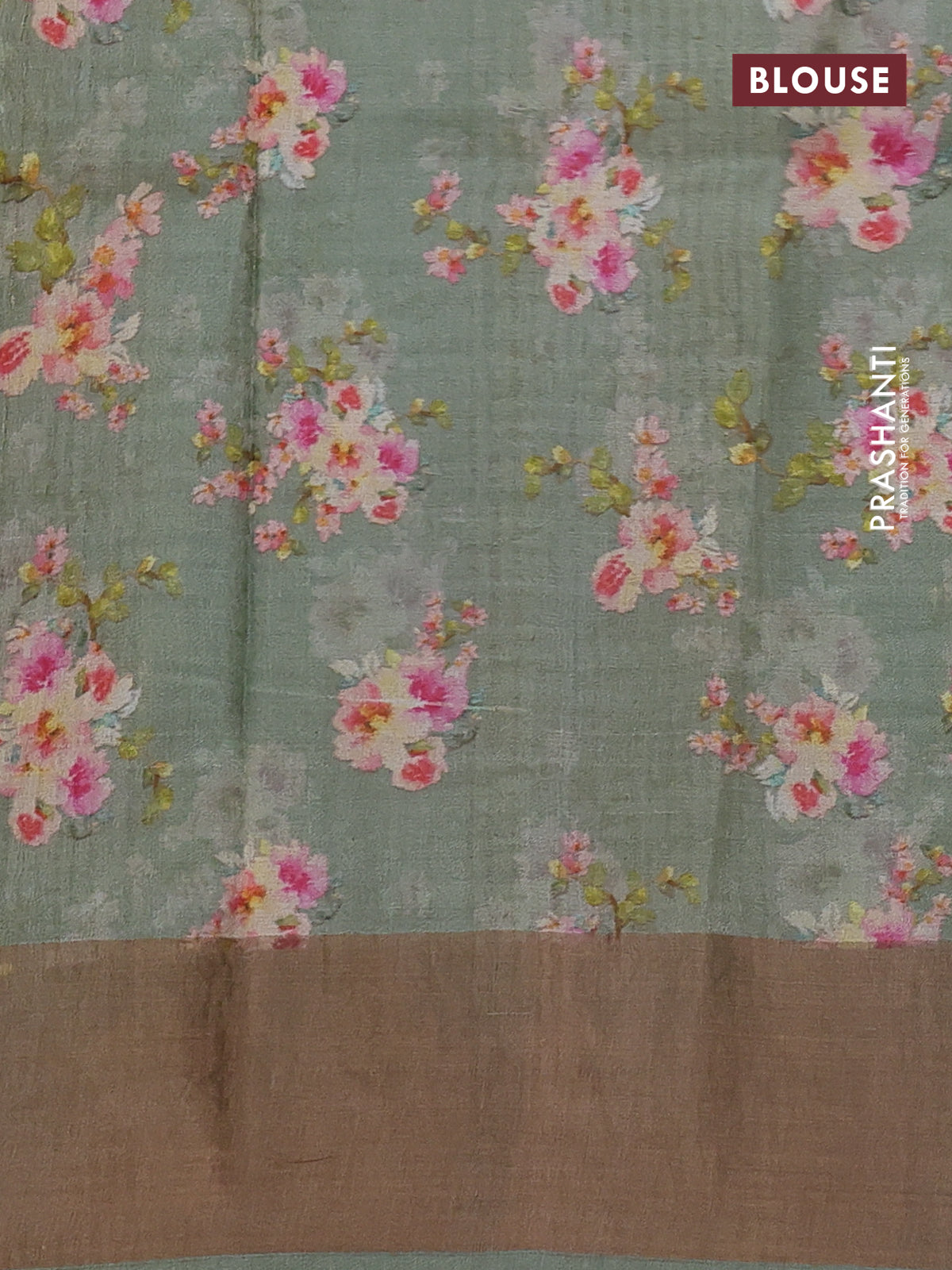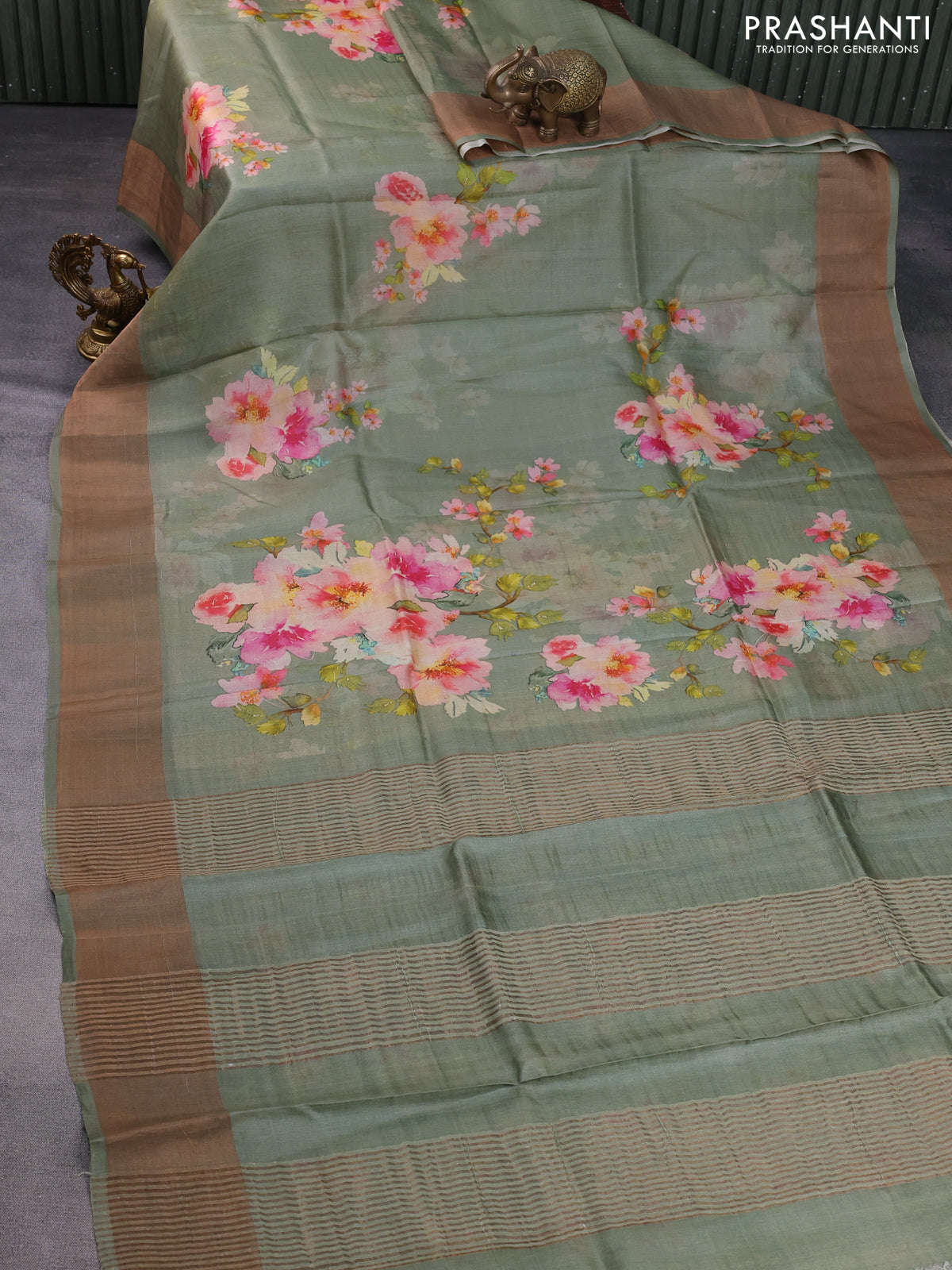 Pure tussar silk saree pastel green with floral digital prints and zari woven border