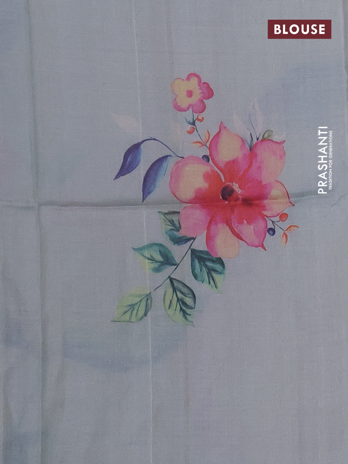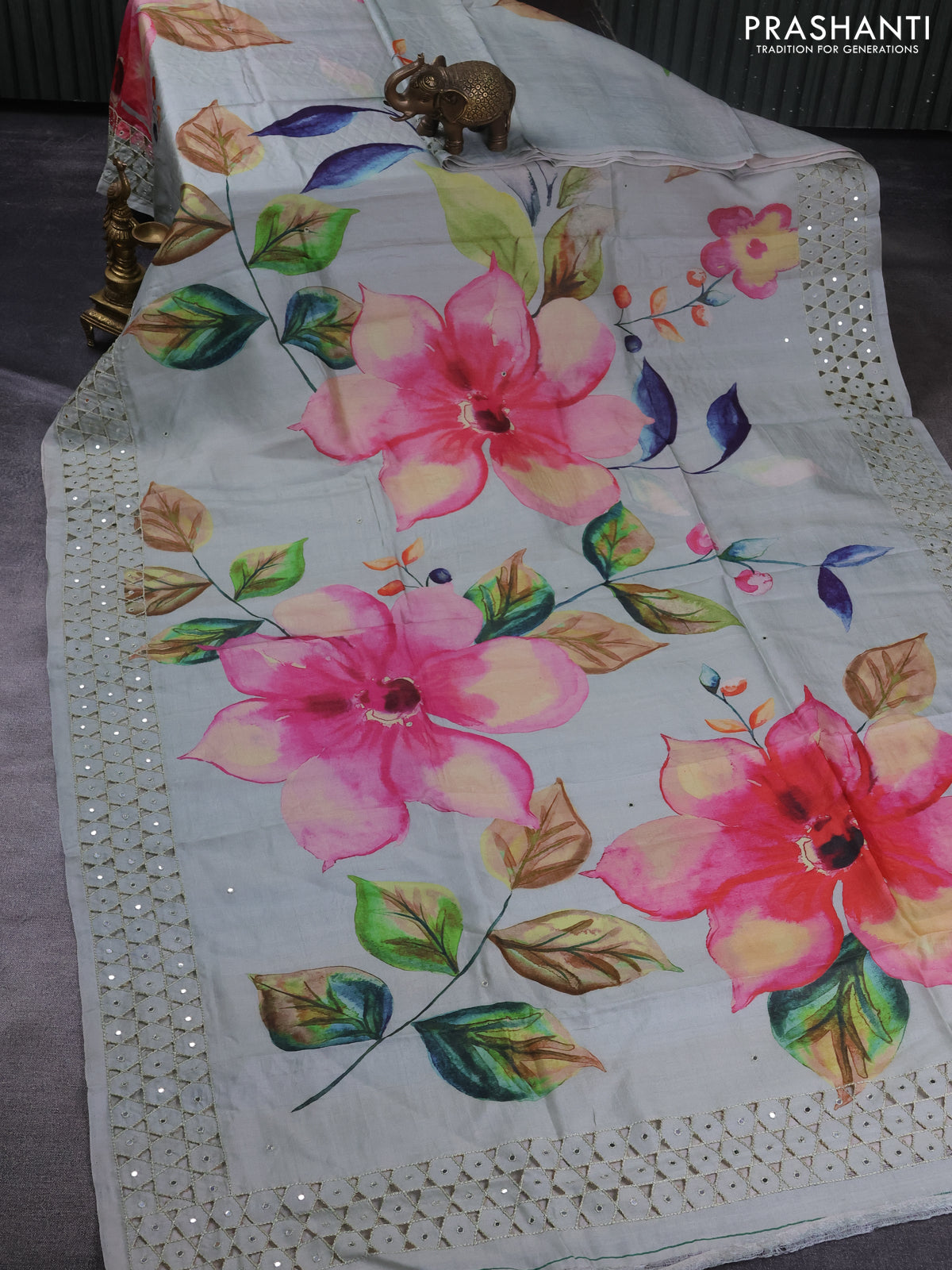 Pure tussar silk saree pastel green with floral digital prints & mirror work and cut work border