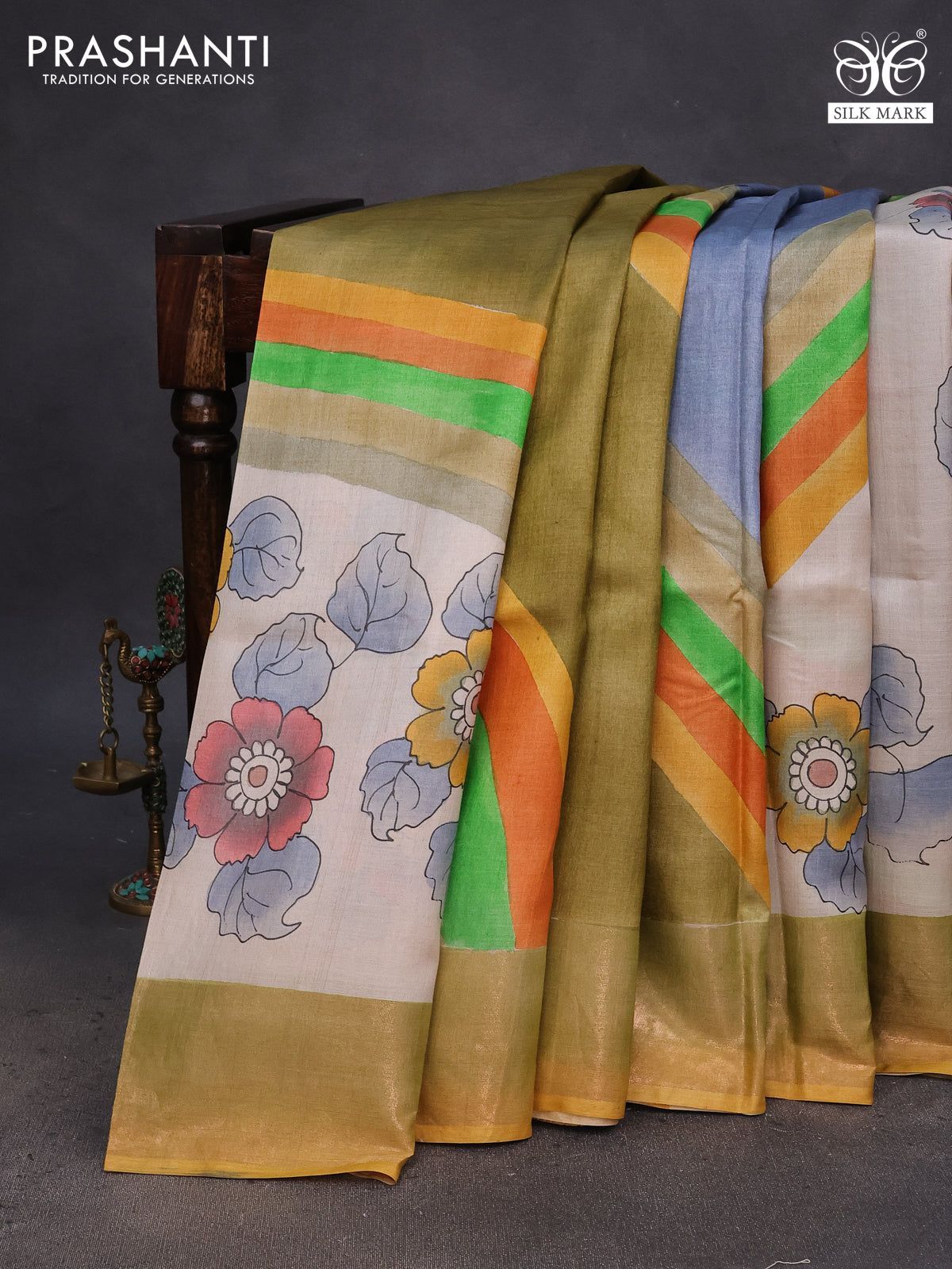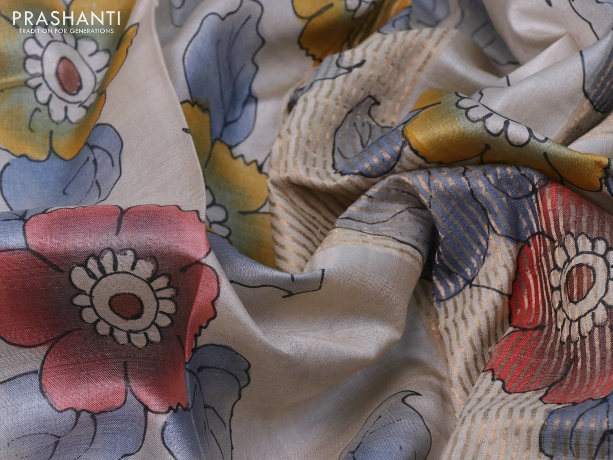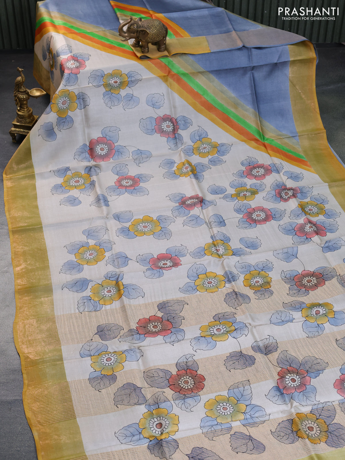 Pure tussar silk saree pastel grey shade and yellow with floral hand painted prints and zari woven border