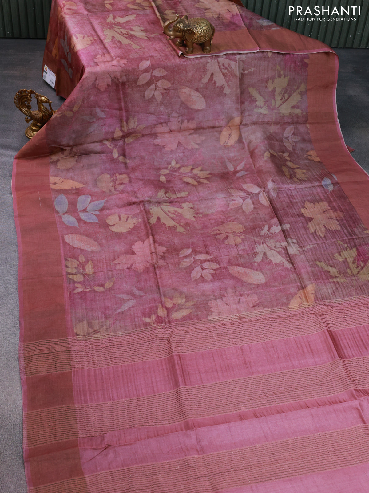 Pure tussar silk saree pastel maroon shade with allover floral digital prints and zari woven border