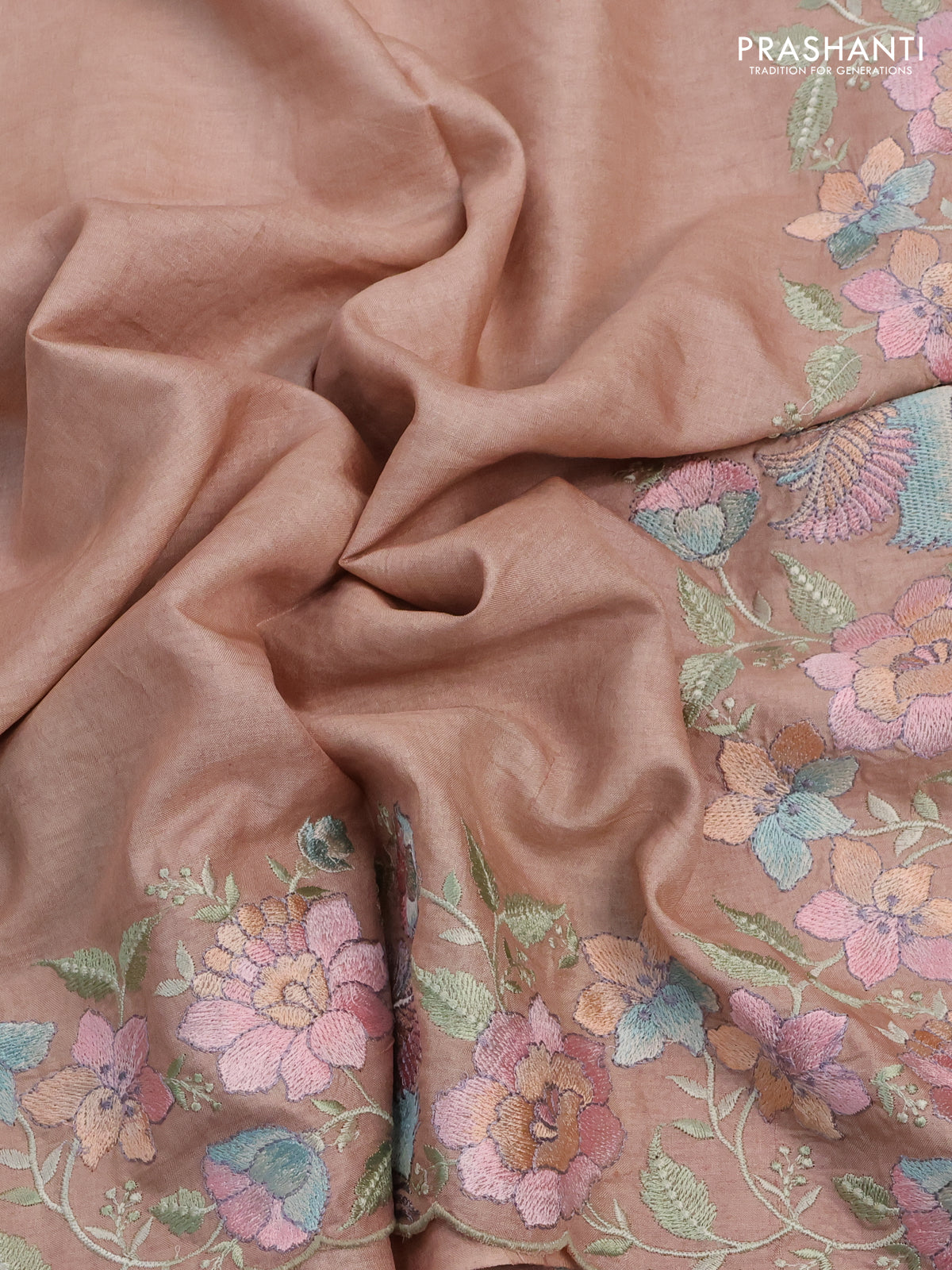 Pure tussar silk saree pastel peach with plain body and floral design embroidery border