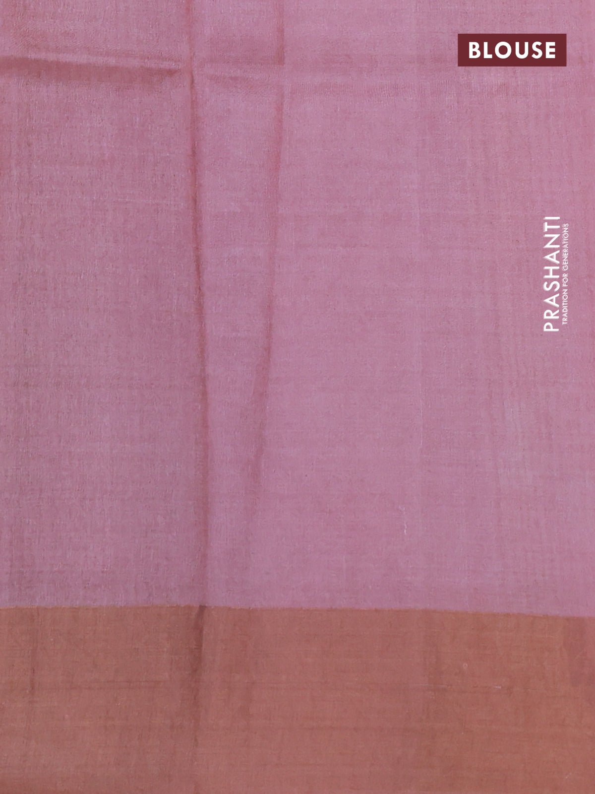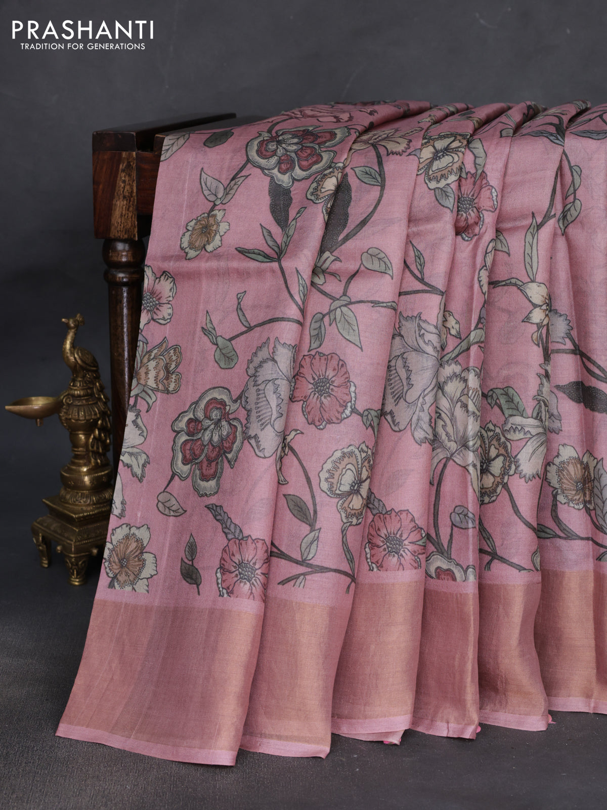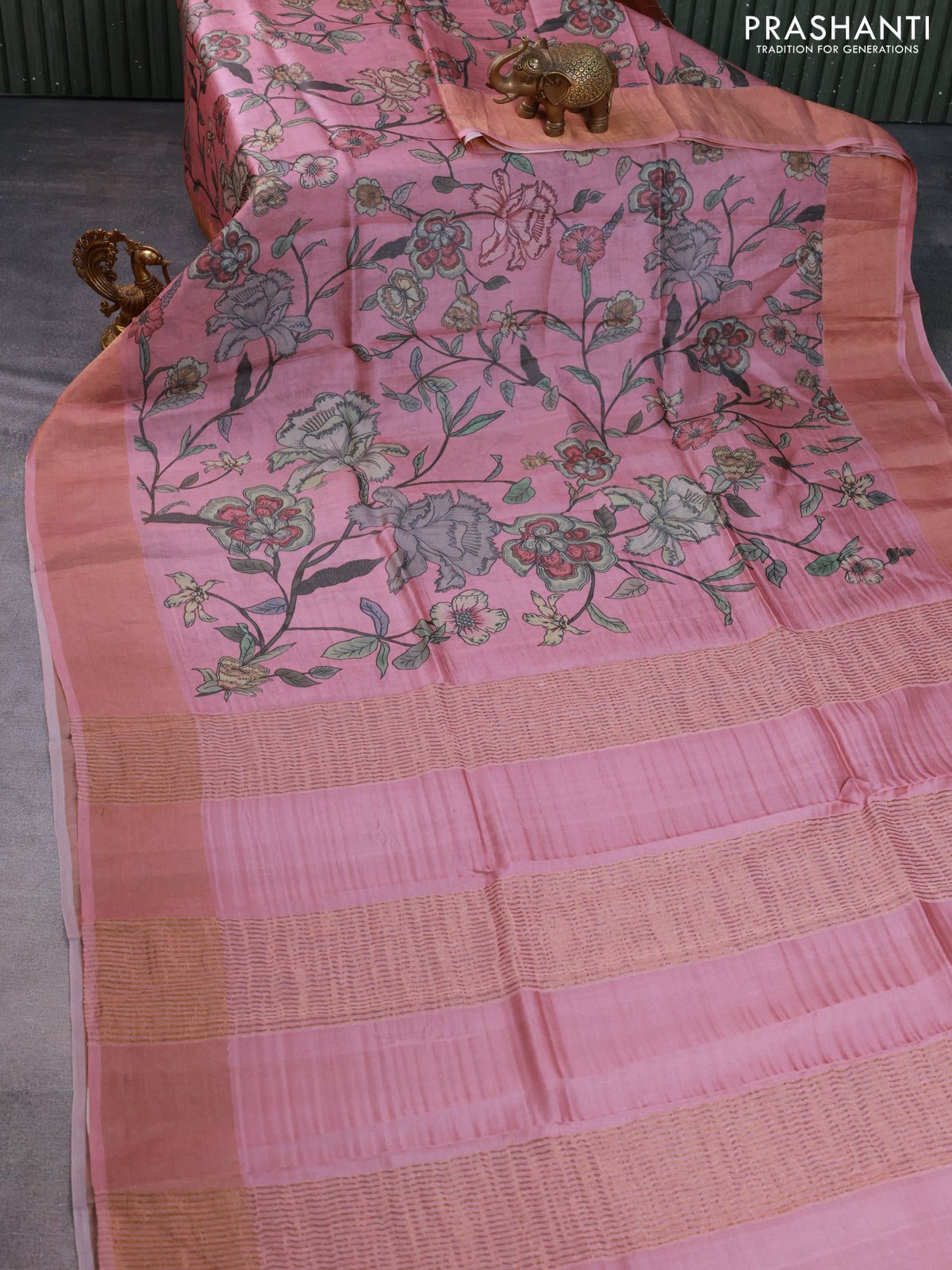 Pure tussar silk saree pastel pink with allover floral digital prints and zari woven border