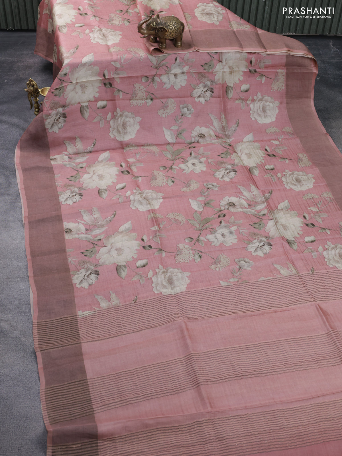 Pure tussar silk saree pastel pink with floral digital prints and zari woven border