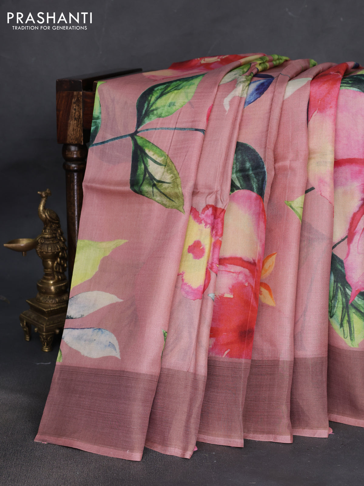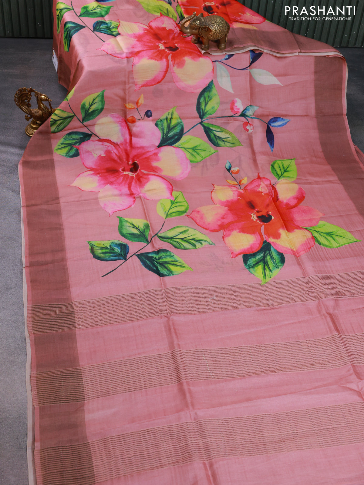 Pure tussar silk saree pastel pink with floral digital prints and zari woven border