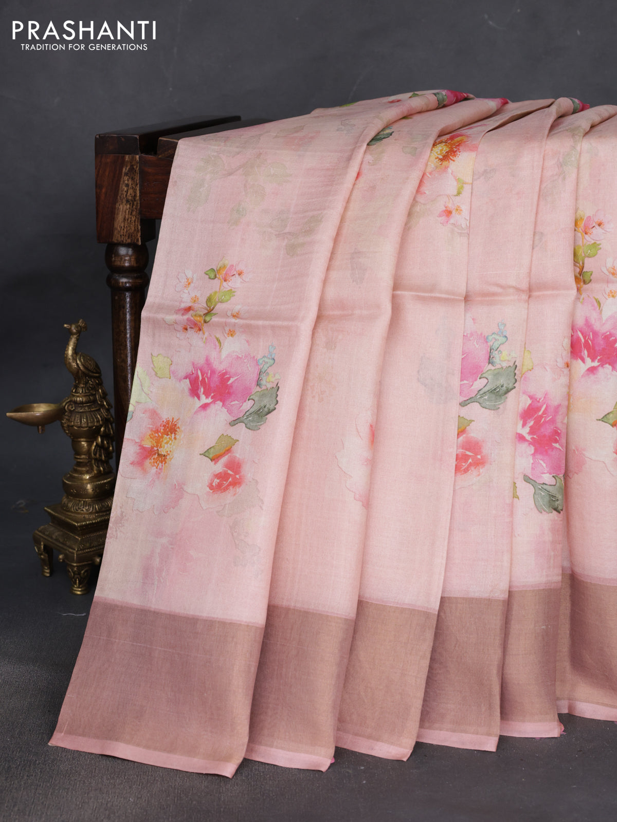 Pure tussar silk saree peach shade with floral digital prints and zari woven border