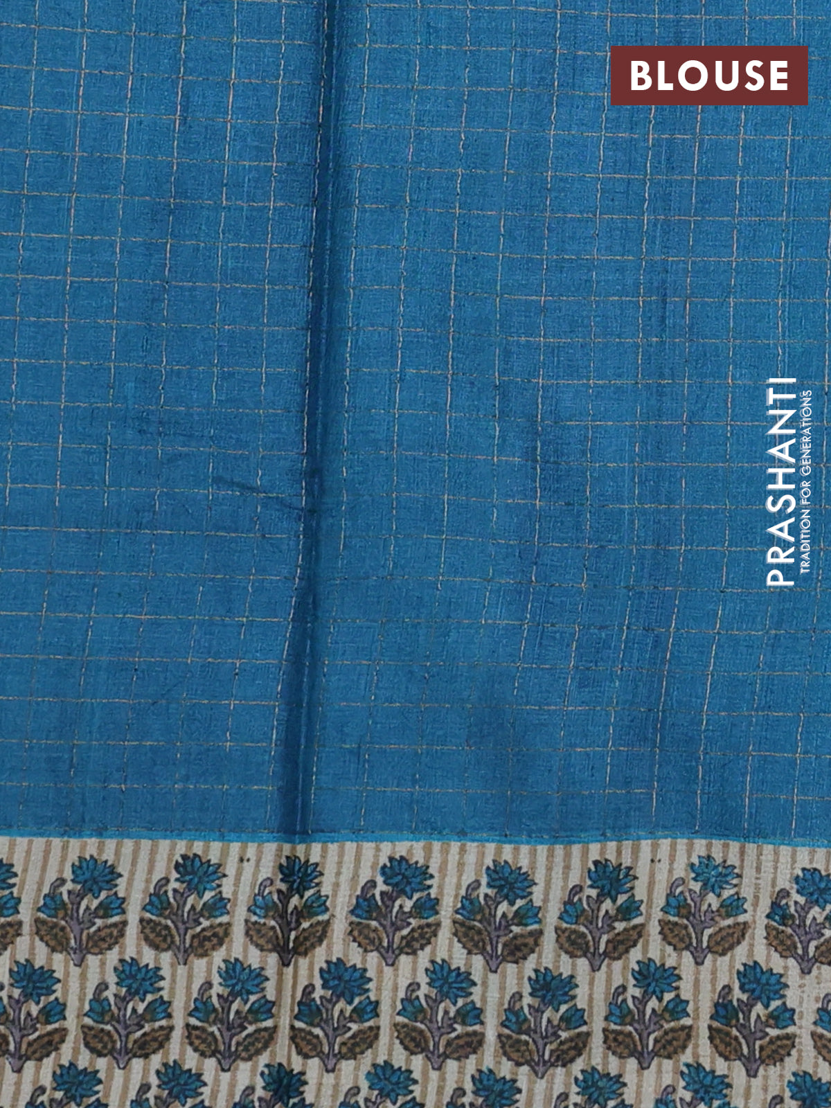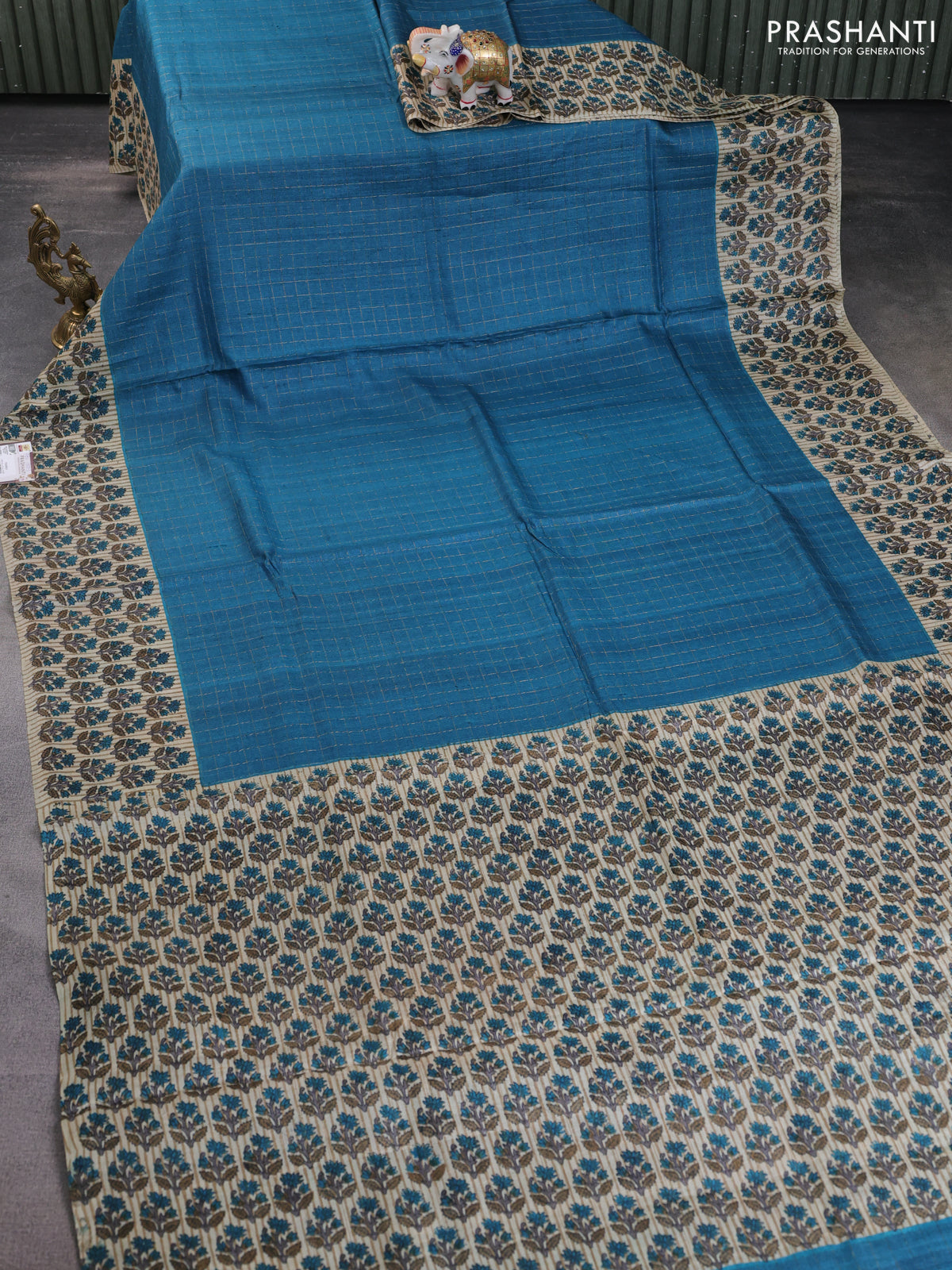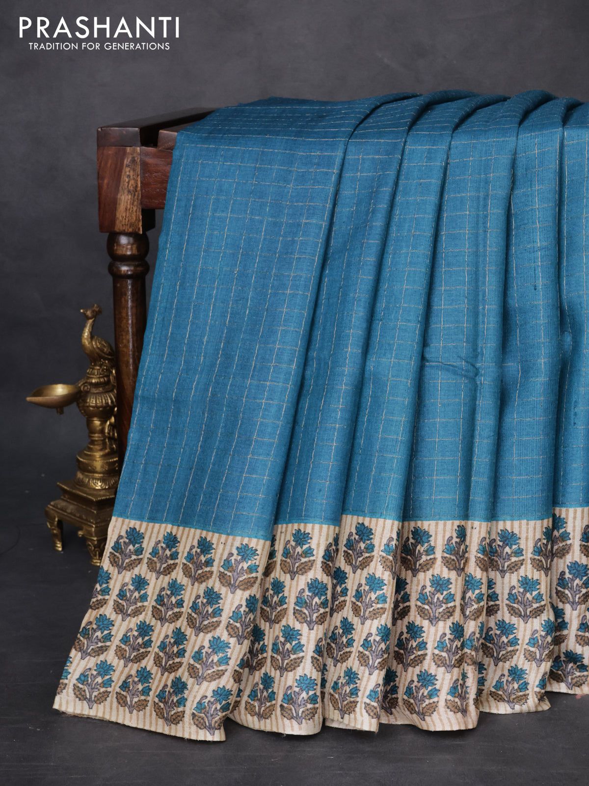 Pure tussar silk saree peacock blue and beige with allover zari checked pattern and floral printed butta border