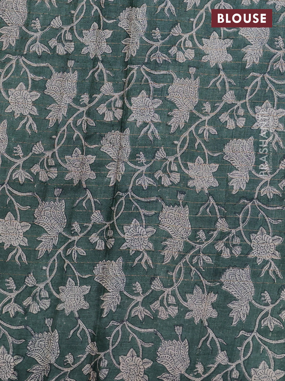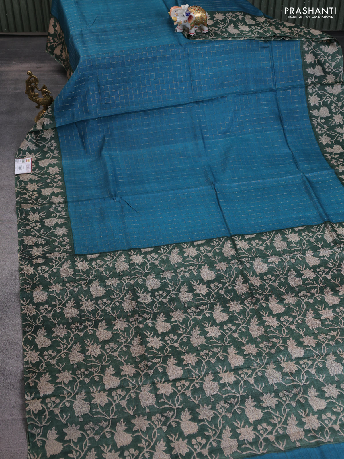 Pure tussar silk saree peacock blue and dark green with allover zari checked pattern and kalamkari printed border
