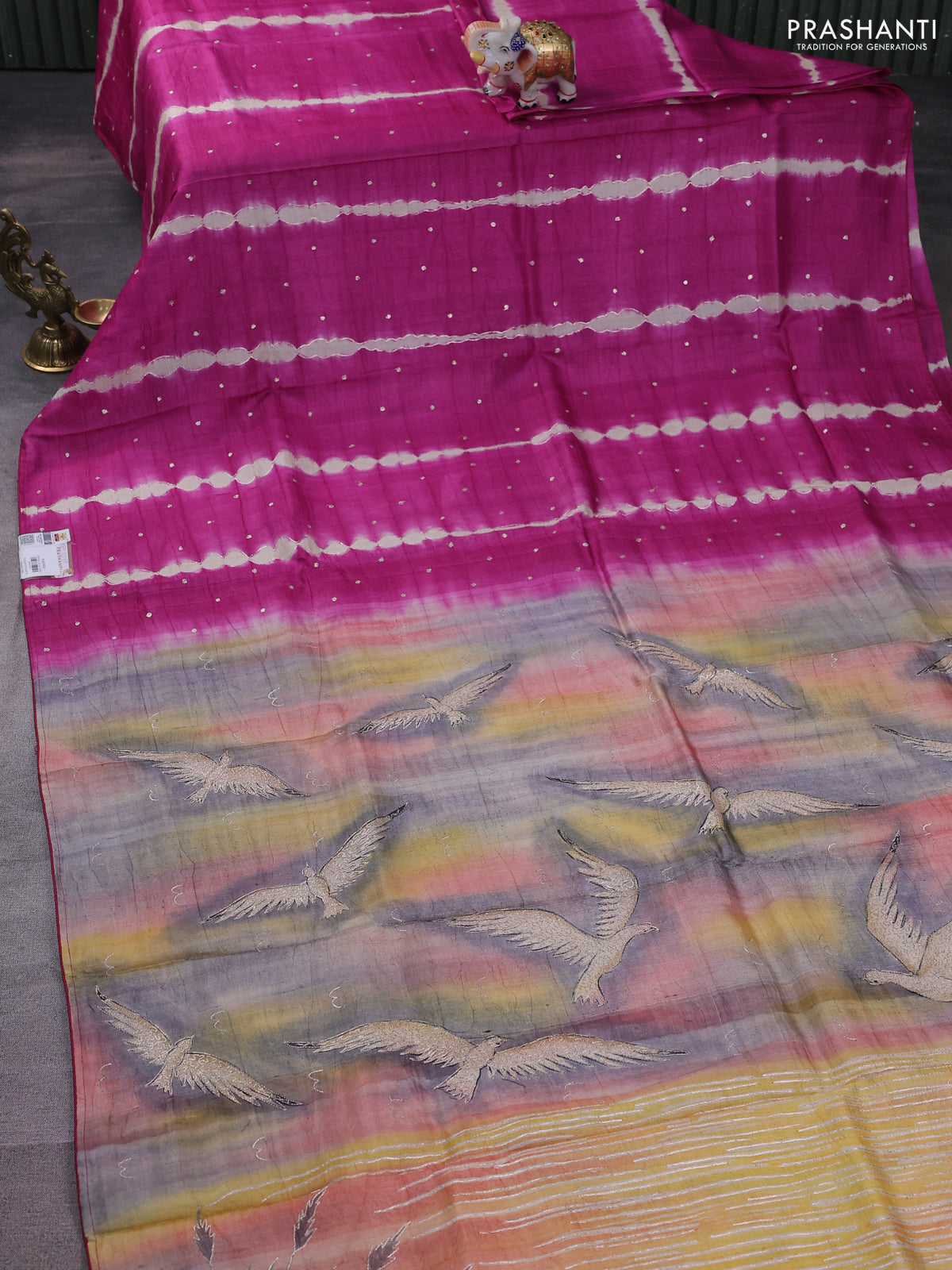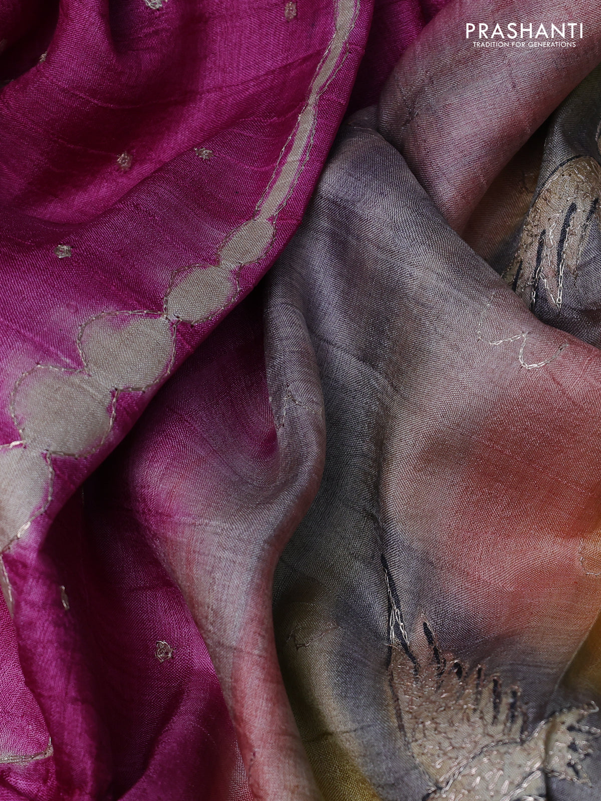 Pure tussar silk saree pink and grey shade with tie & dye prints and pita work pallu