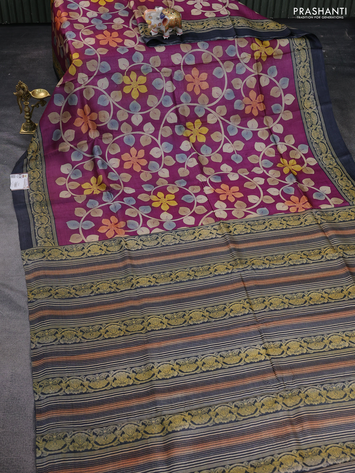 Pure tussar silk saree purple and elephant grey with kalamkari hand painted prints and printed border