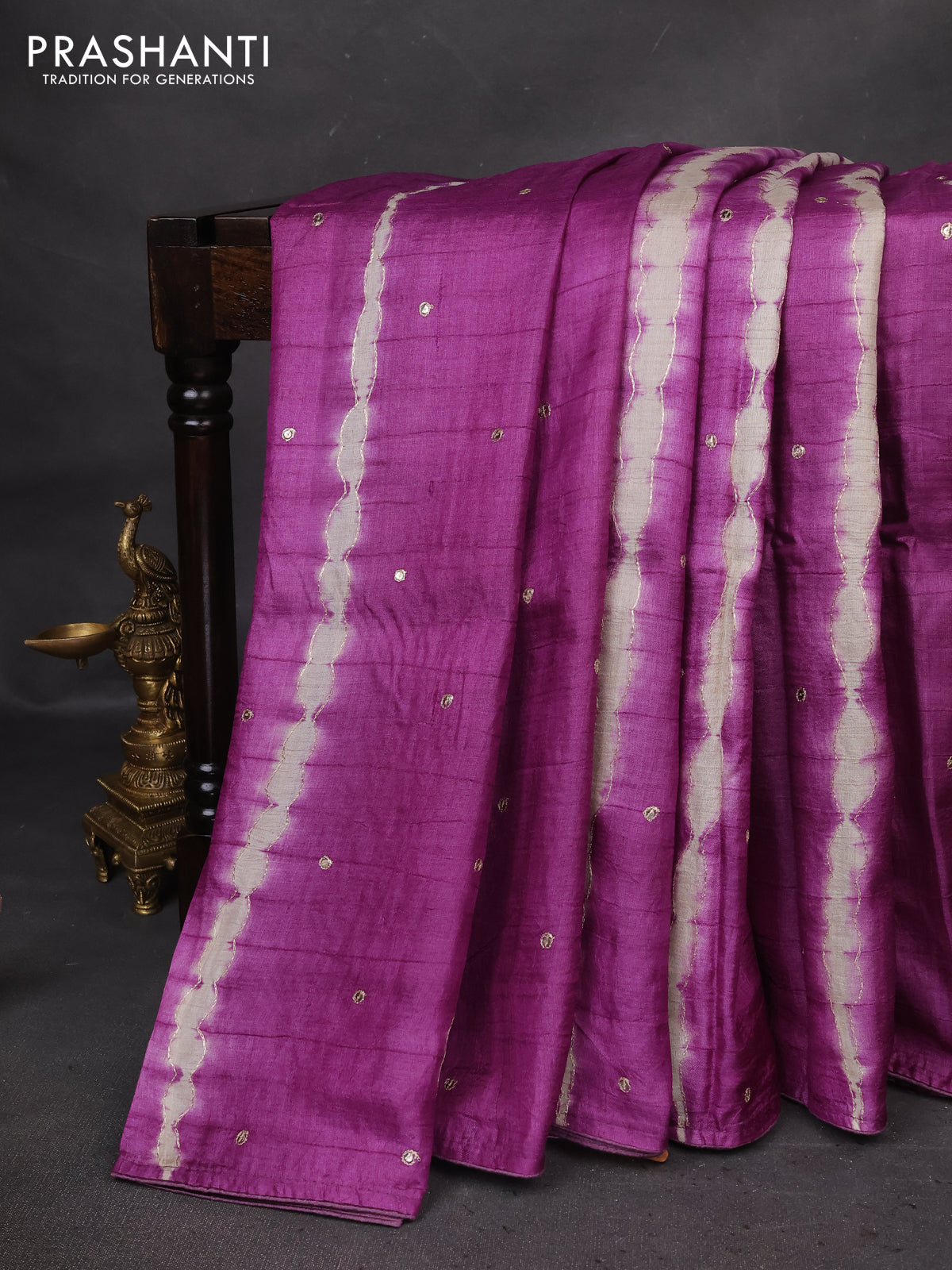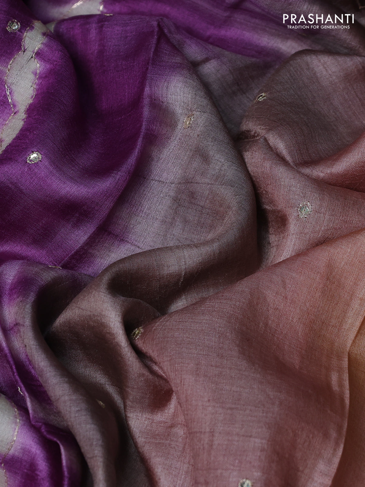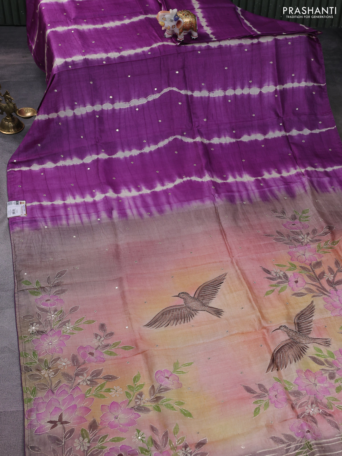 Pure tussar silk saree purple shade and orange with tie & dye prints and pita work pallu
