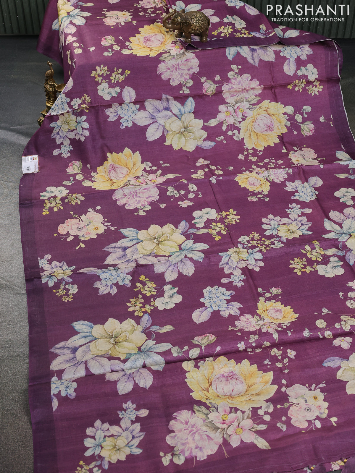 Pure tussar silk saree purple shade with allover floral digital prints in borderless style