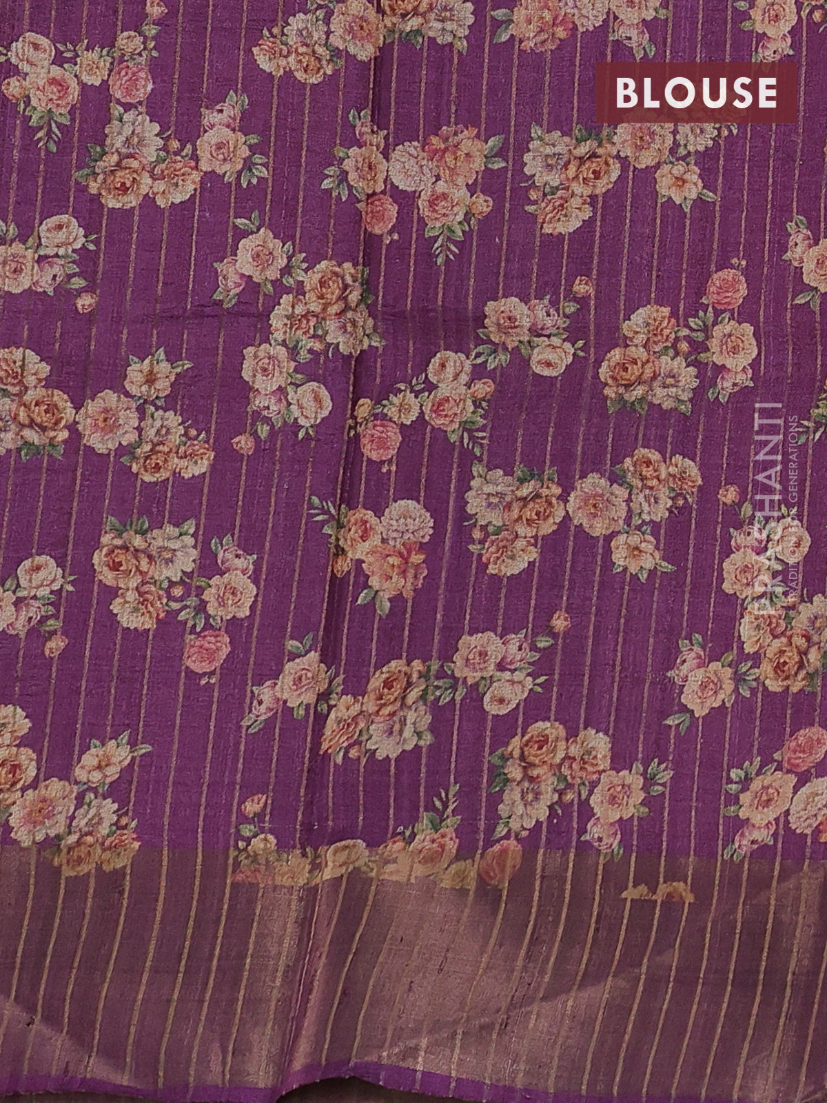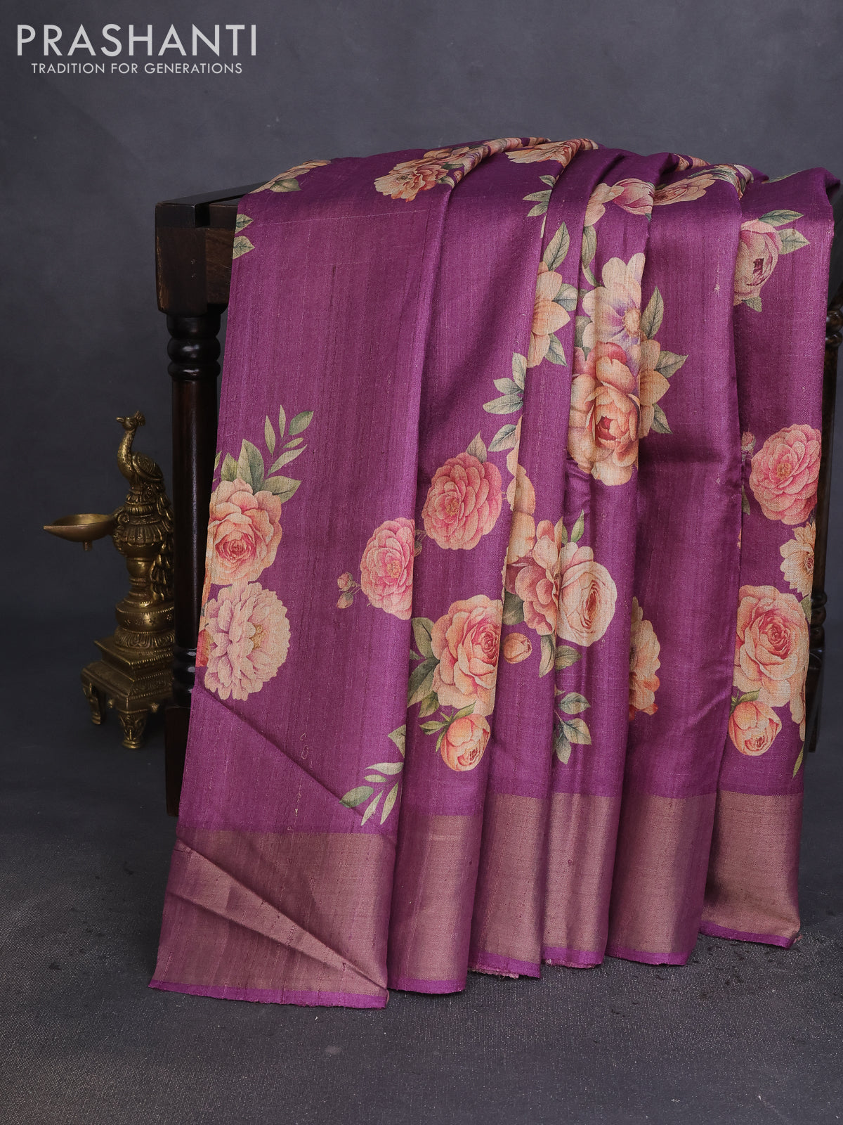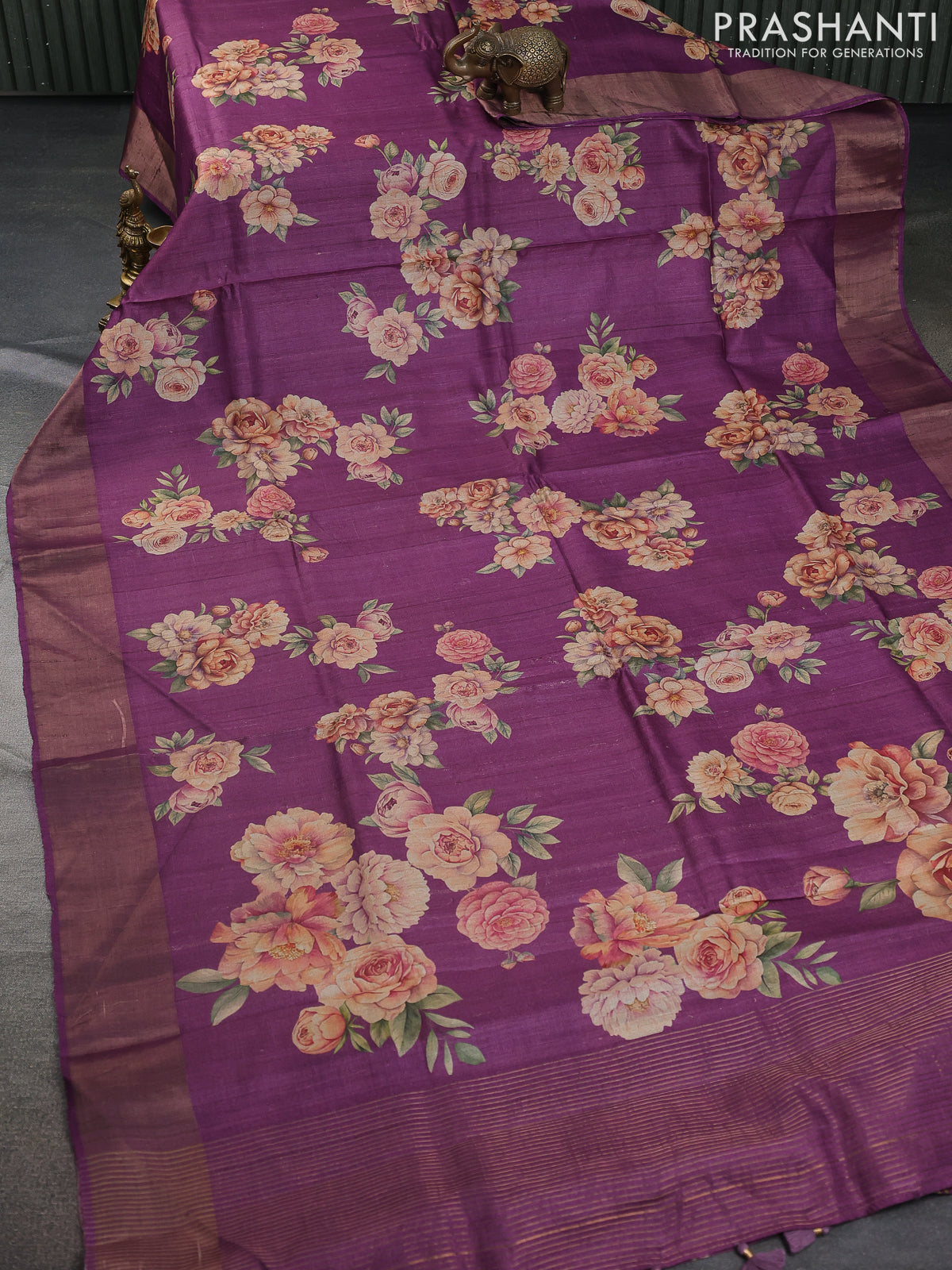Pure tussar silk saree purple with floral digital prints and zari woven border