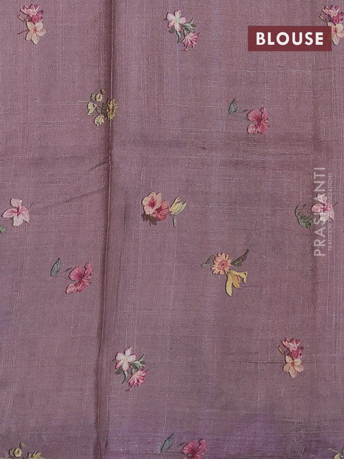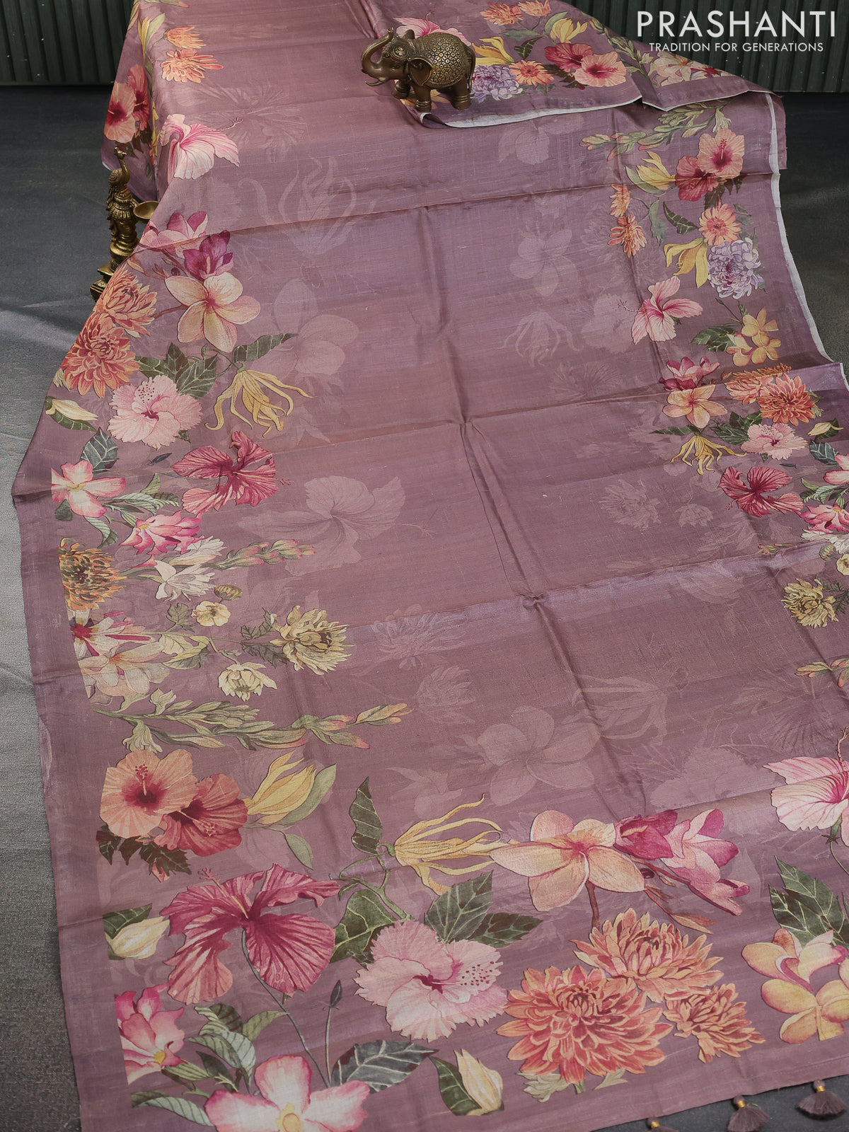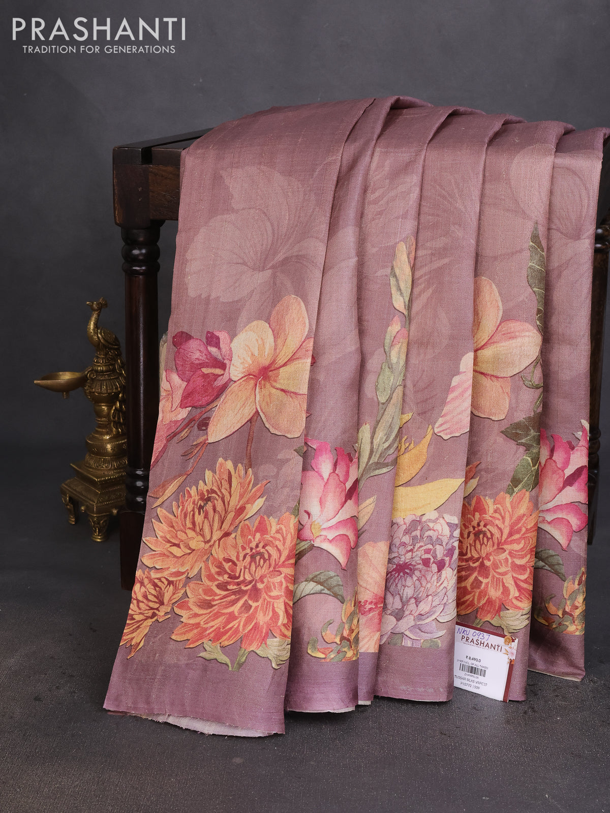 Pure tussar silk saree rosy brown with allover floral digital prints in borderless style
