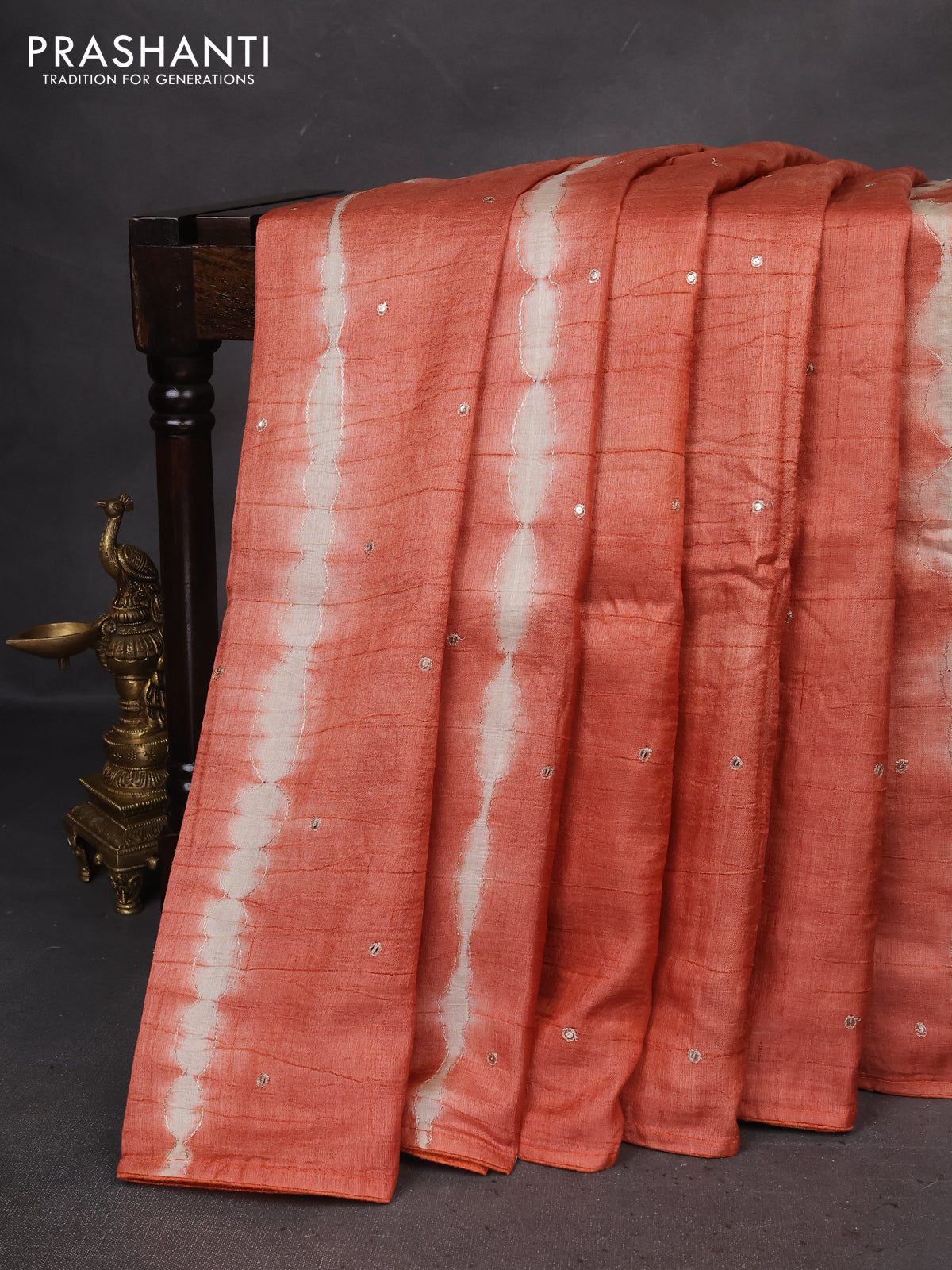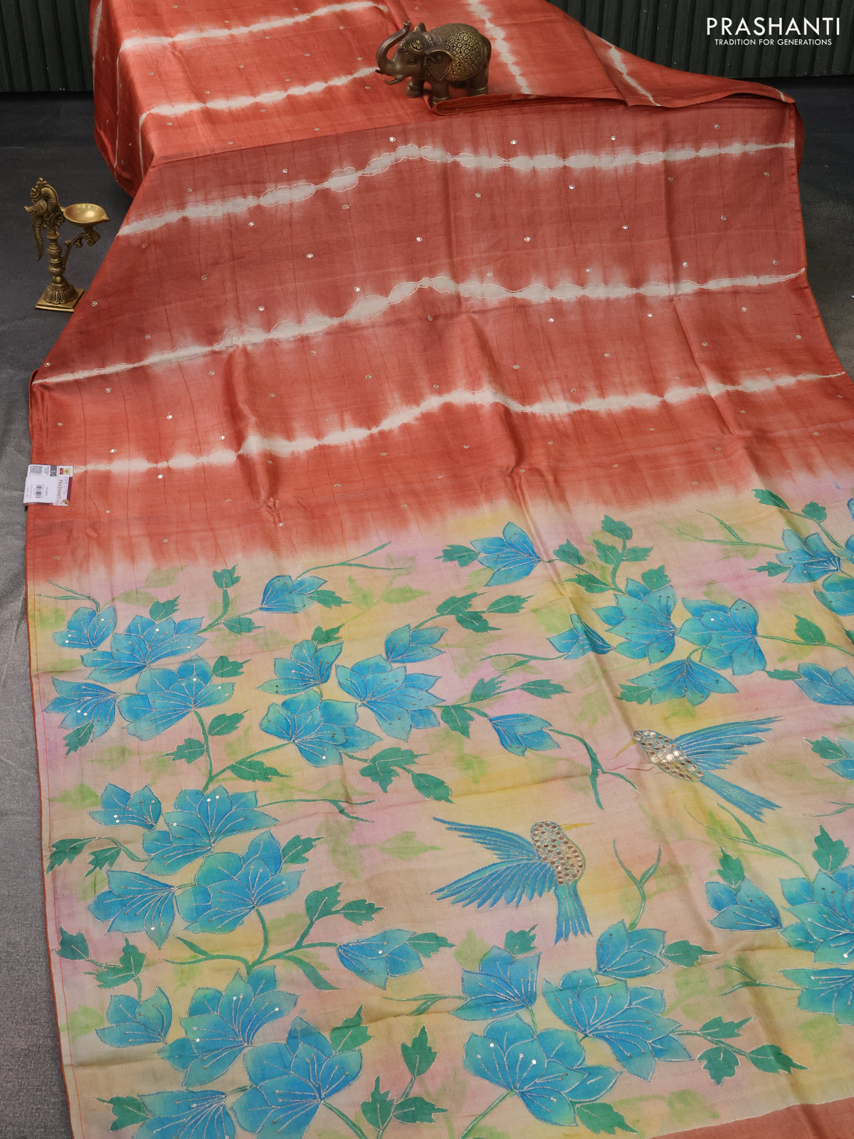 Pure tussar silk saree rust sahde and cream with tie & dye prints and pita work pallu