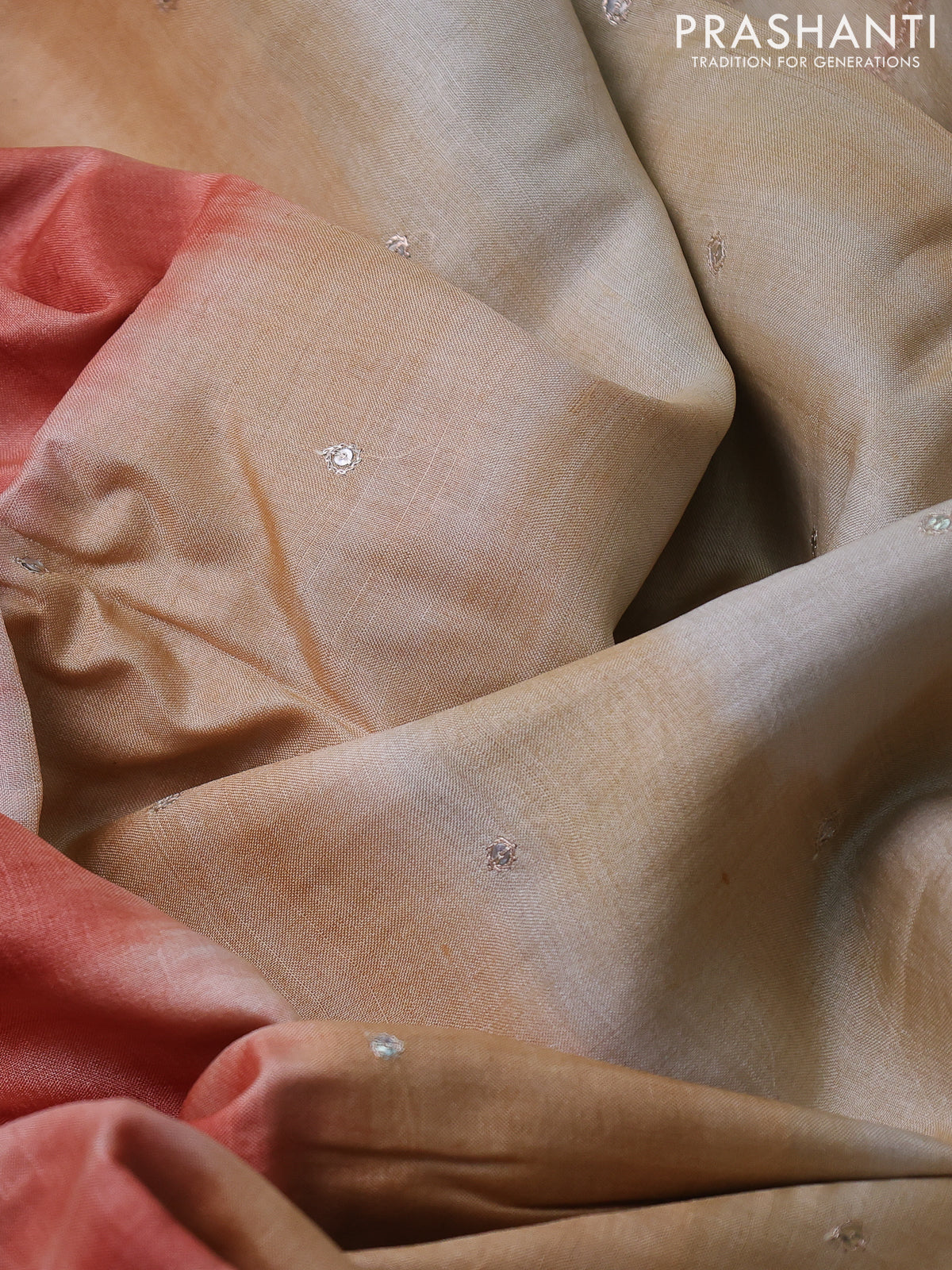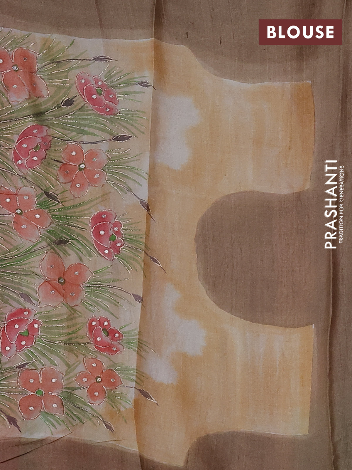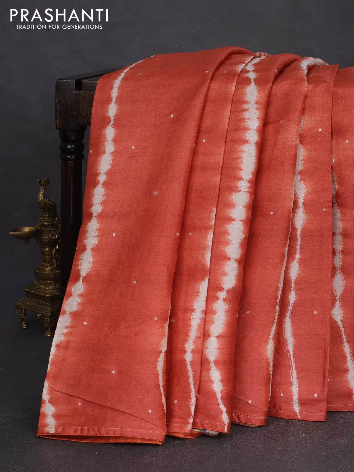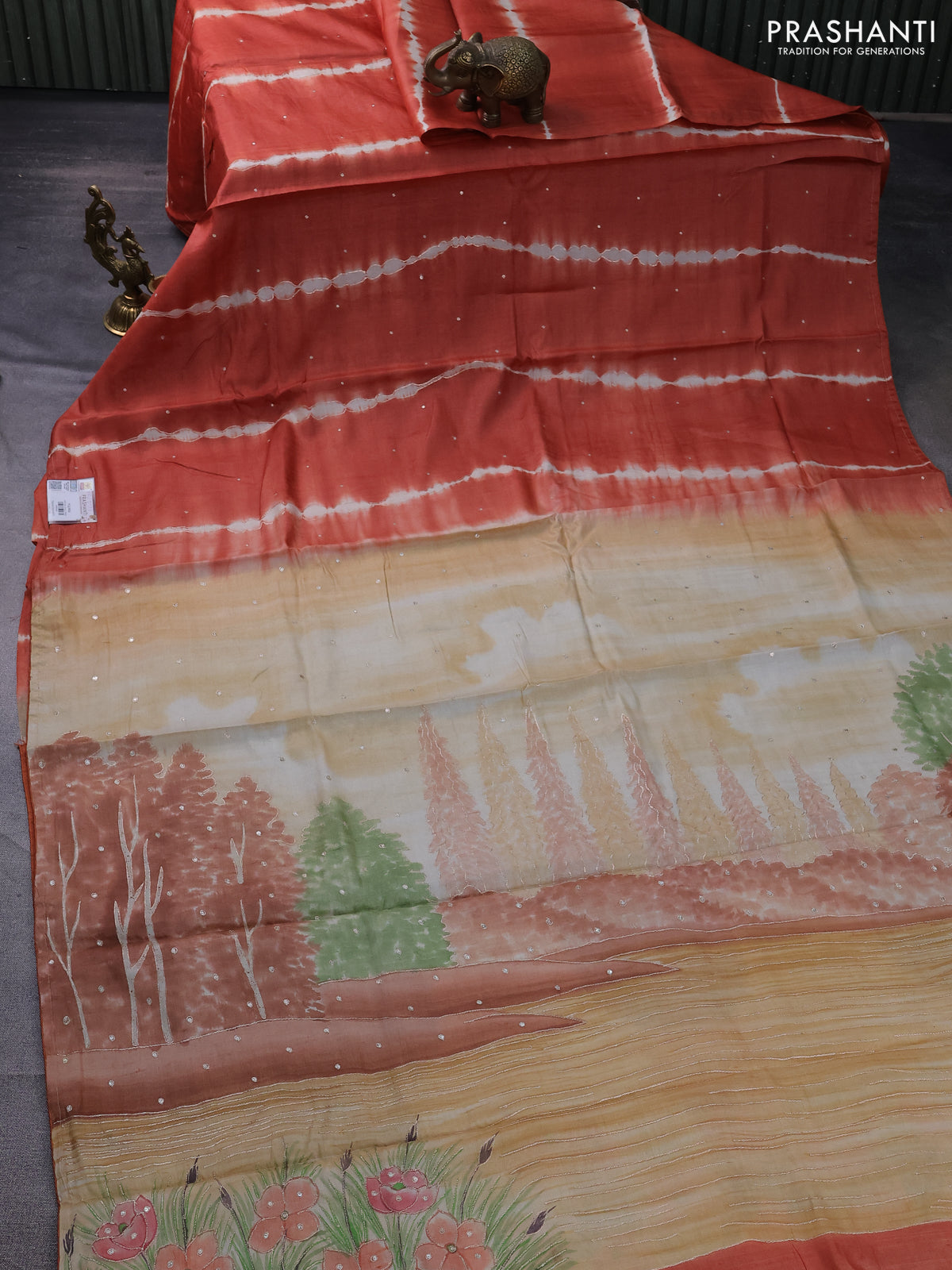 Pure tussar silk saree rustic orange and sandal with tie & dye prints & pita work and embroidery pallu