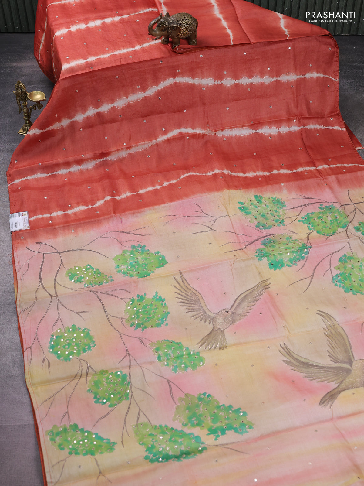 Pure tussar silk saree rustic orange and yellow with tie & dye prints and pita work pallu