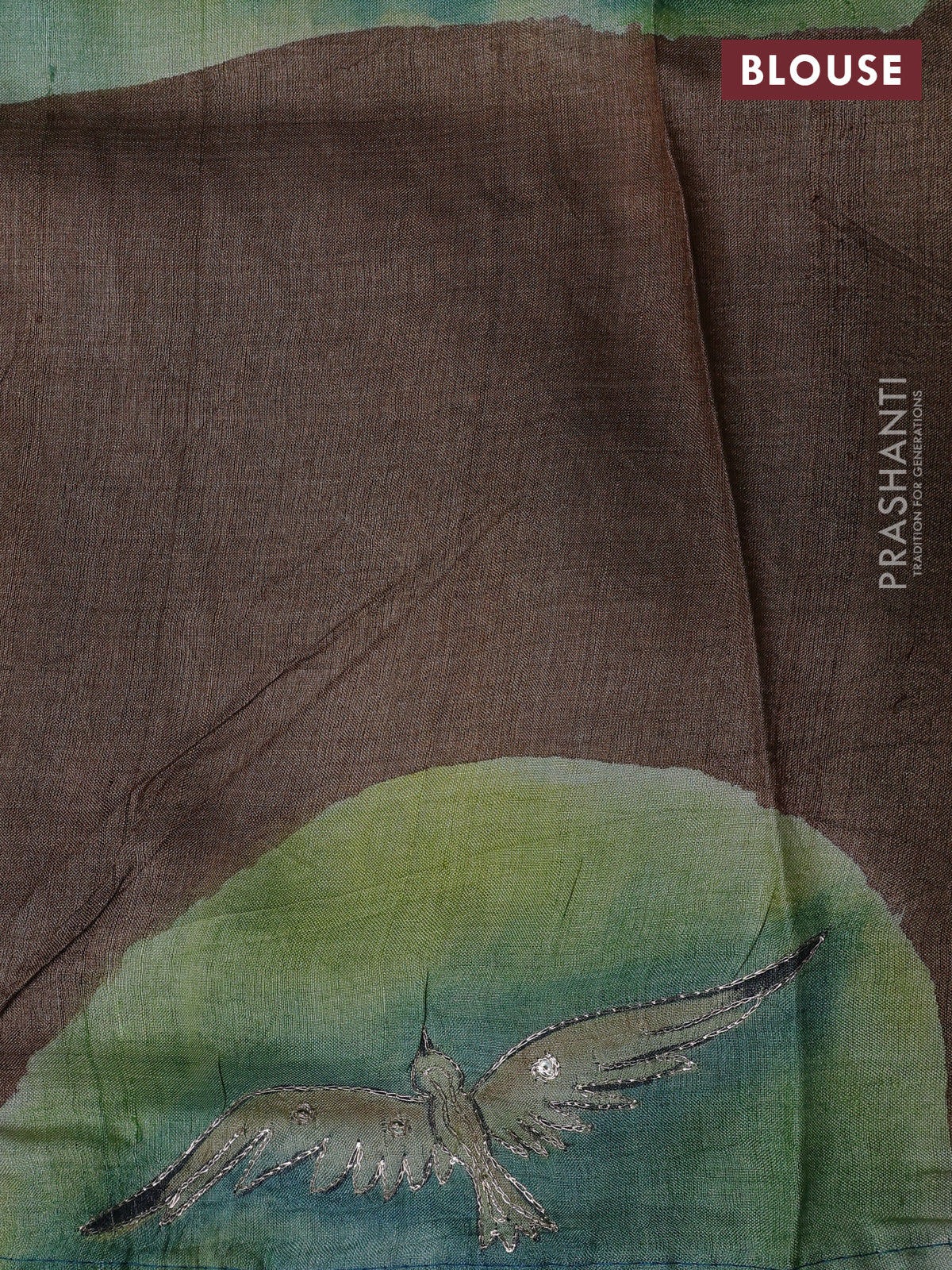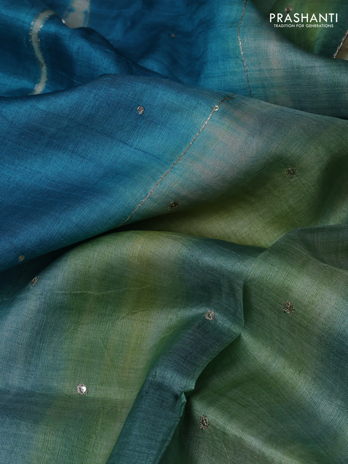 Pure tussar silk saree teal blue and green shade with tie & dye prints and pita work pallu