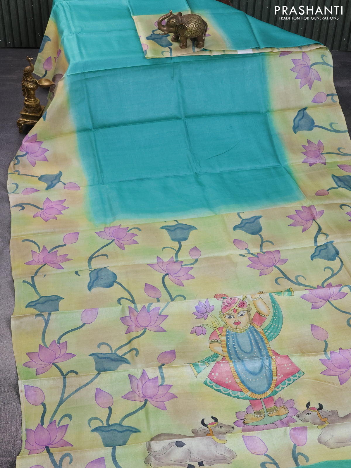 Pure tussar silk saree teal blue and green with plain body and pichwai hand painted pallu & border