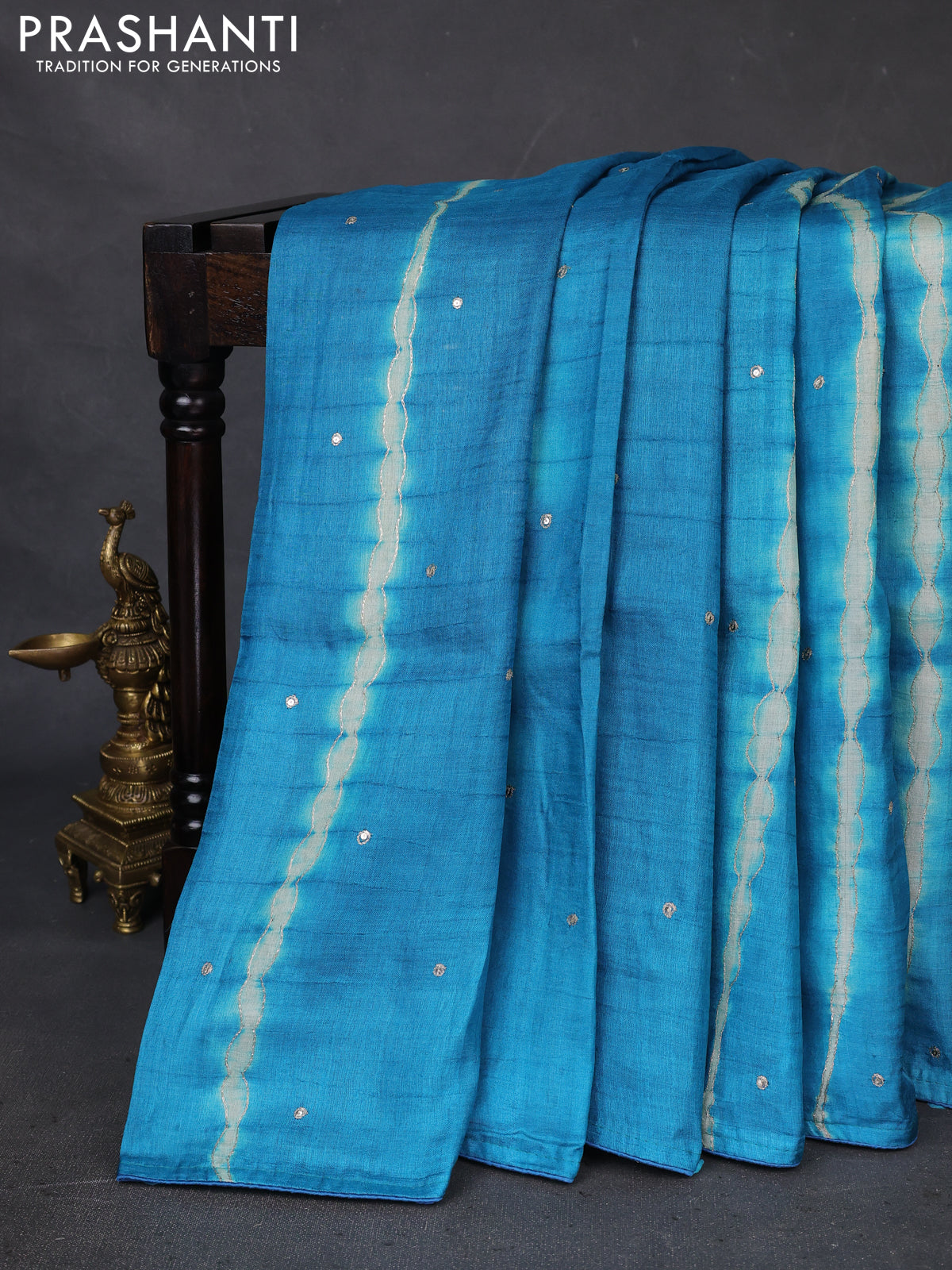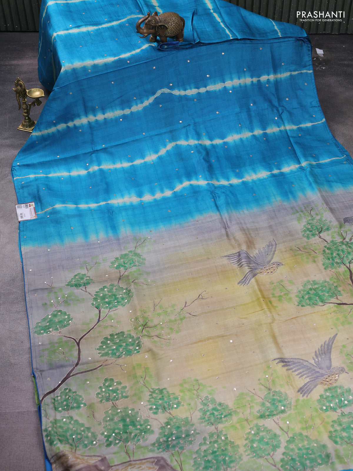 Pure tussar silk saree teal blue and light green with tie & dye prints and pita work pallu