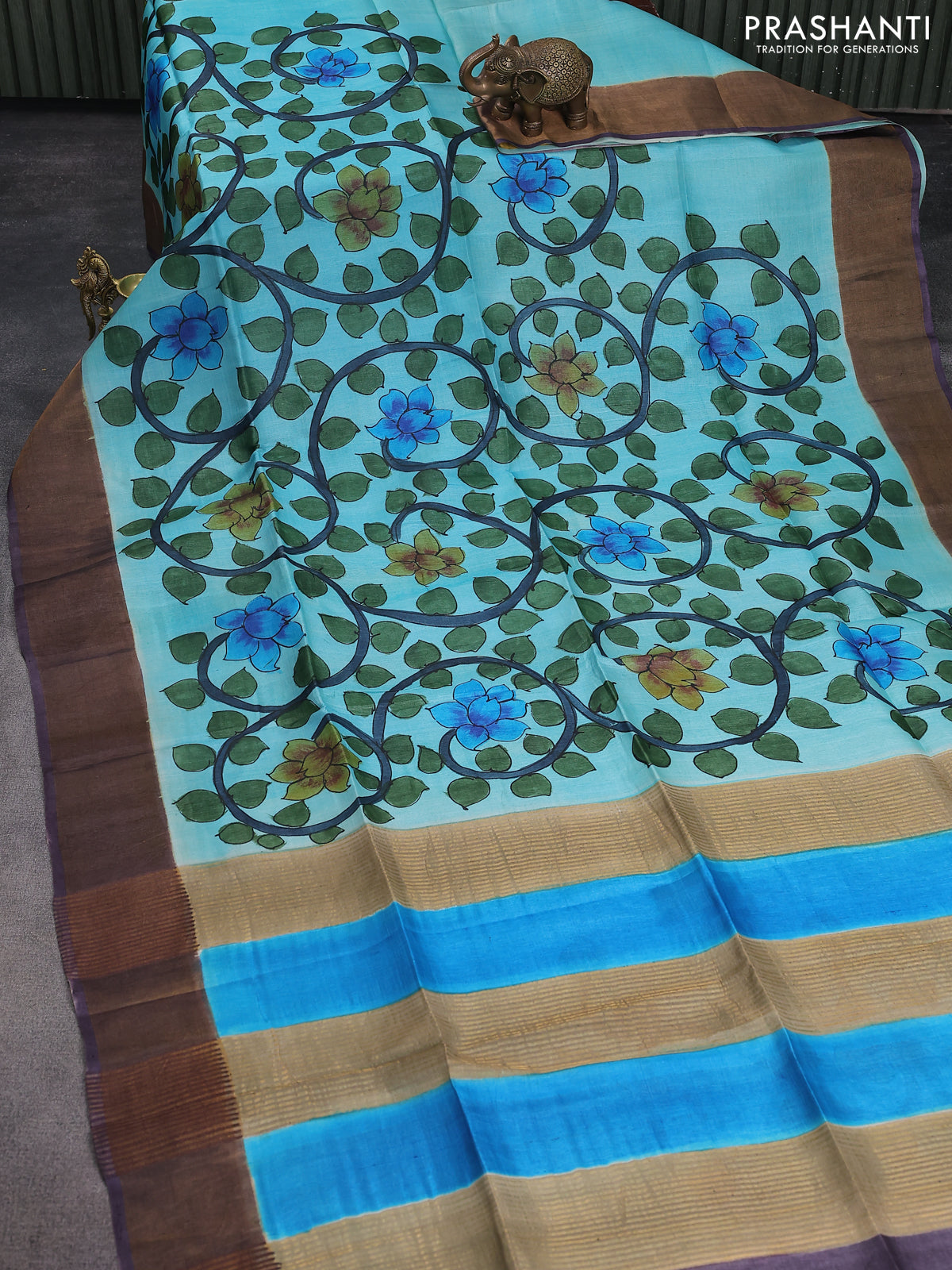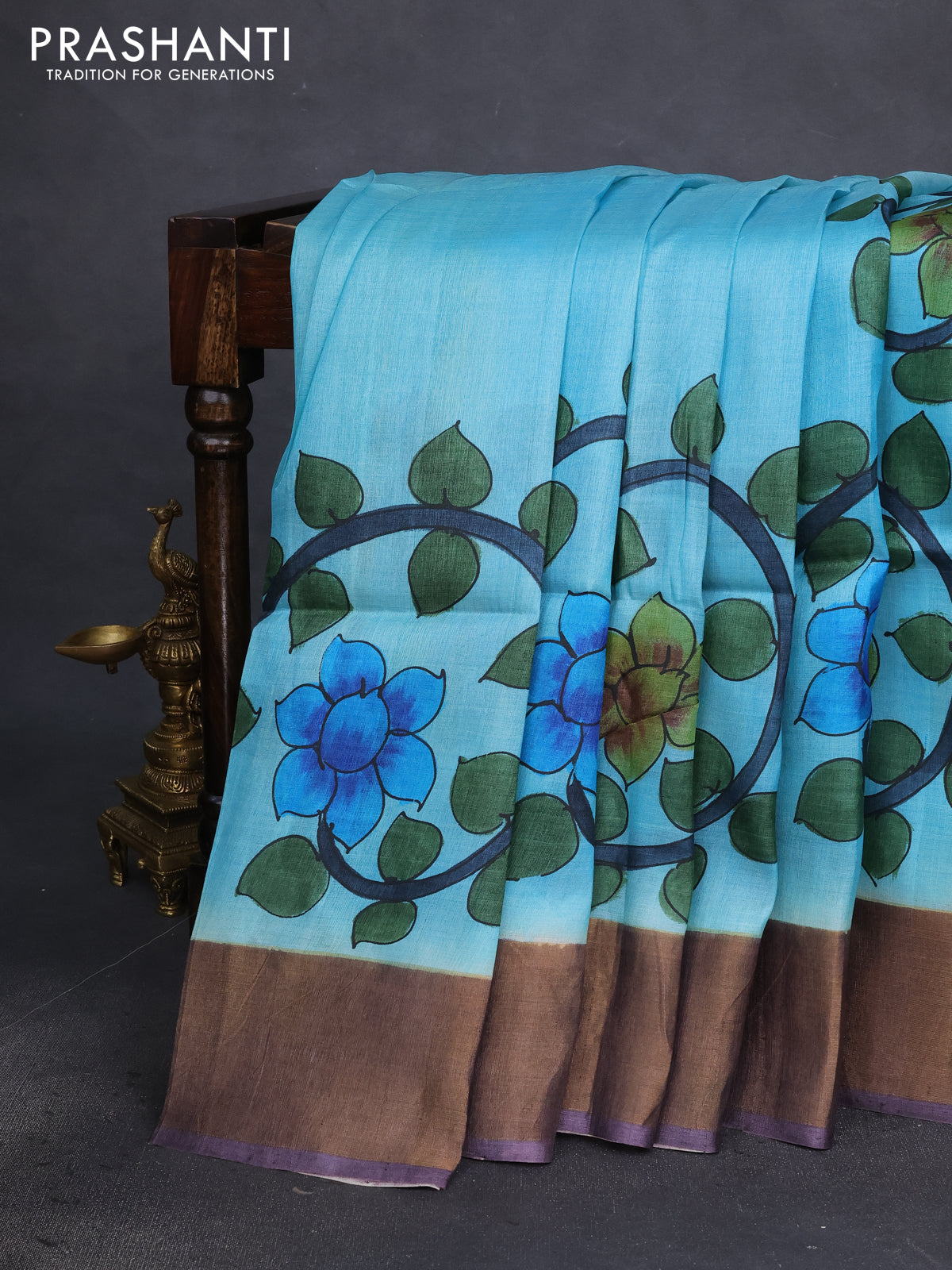 Pure tussar silk saree teal blue and pastel wine shade with allover kalamkari hand painted prints and zari woven border