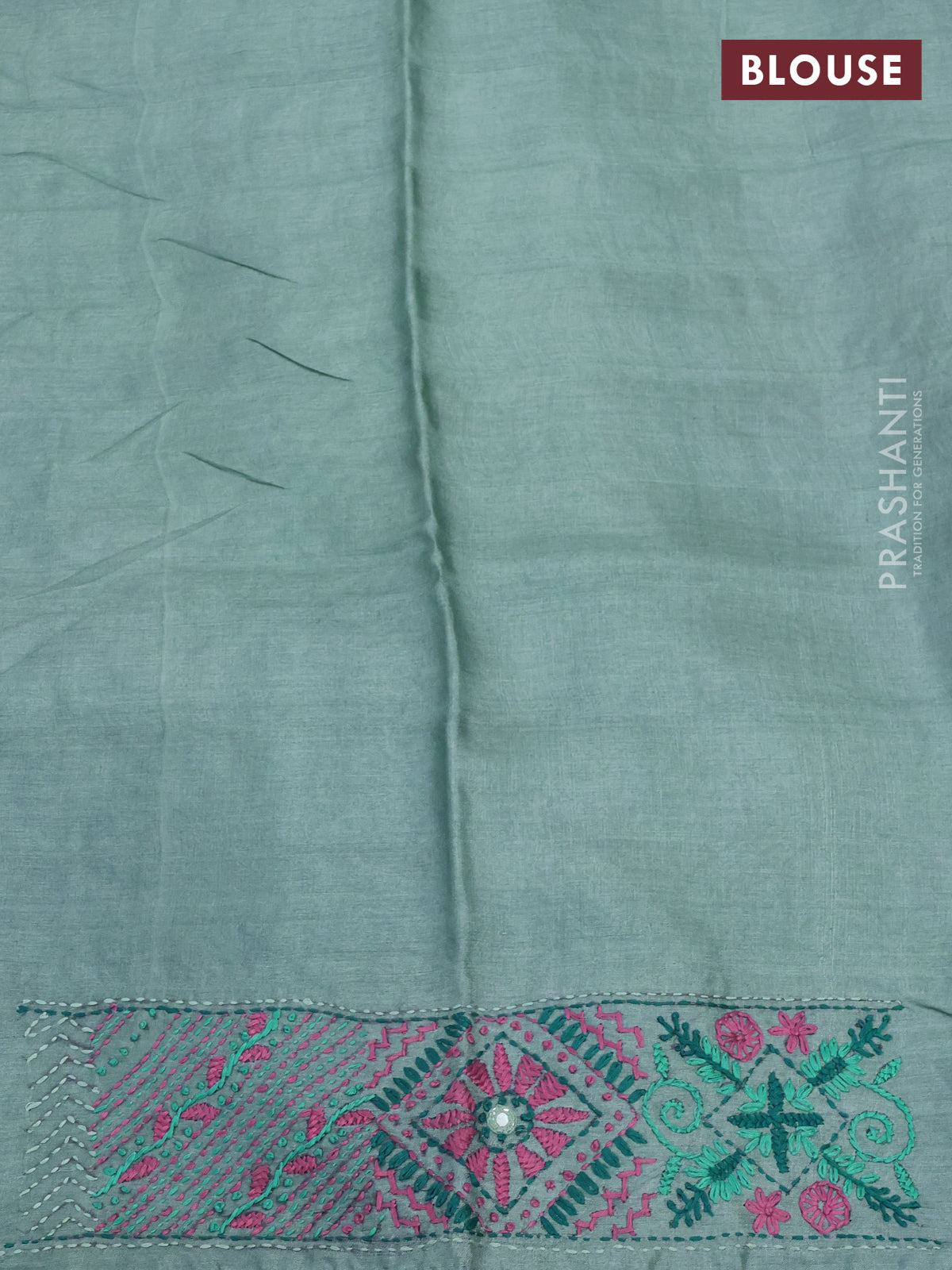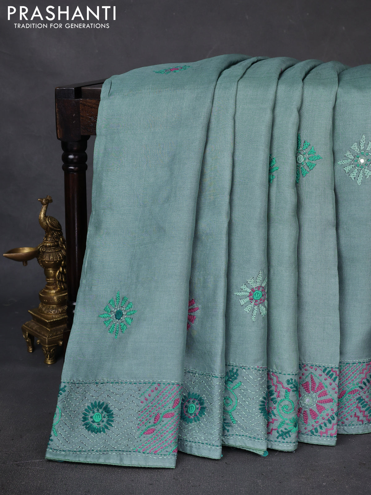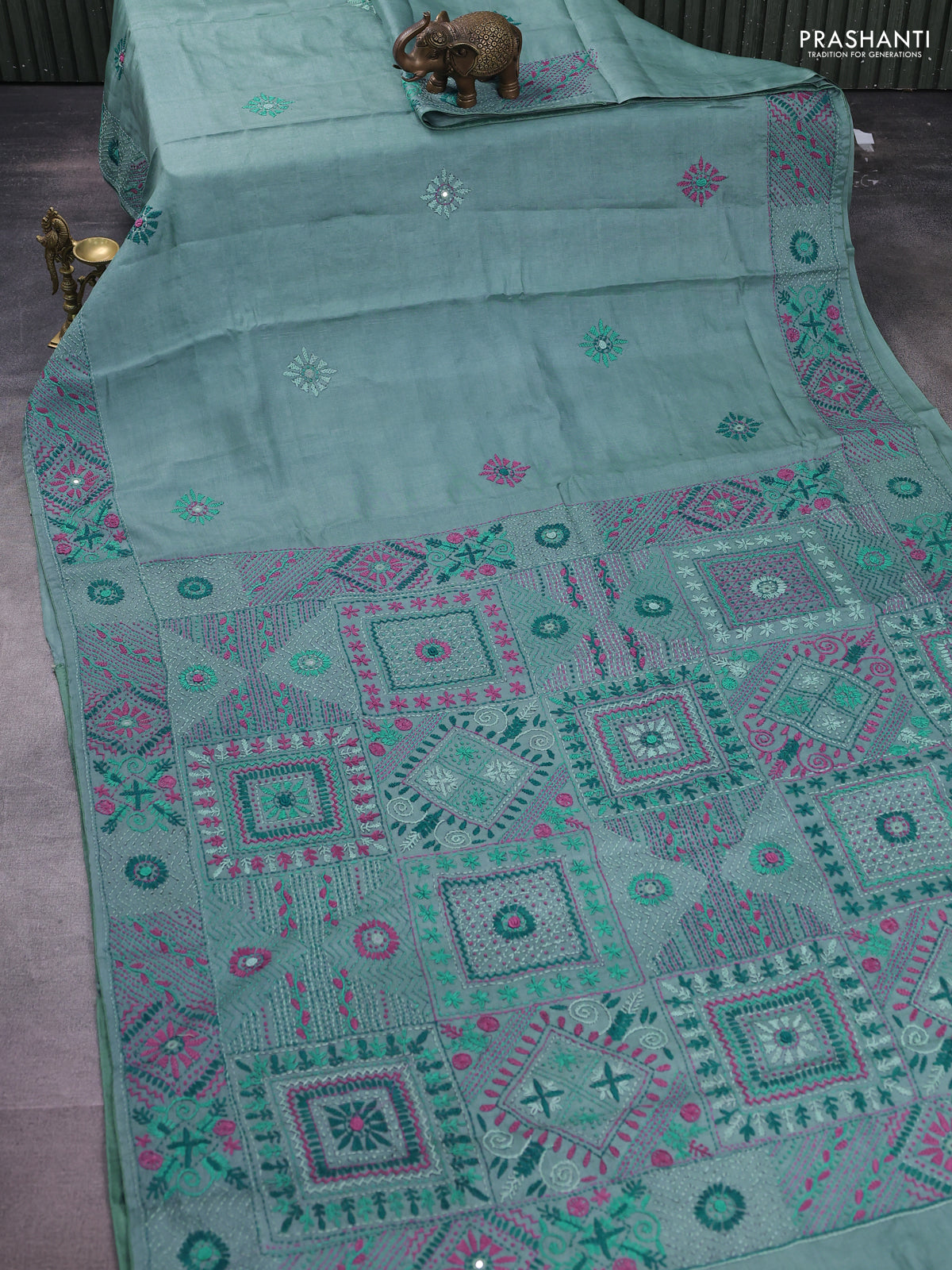 Pure tussar silk saree teal blue with embrioidery work buttas and kantha stitch work pallu