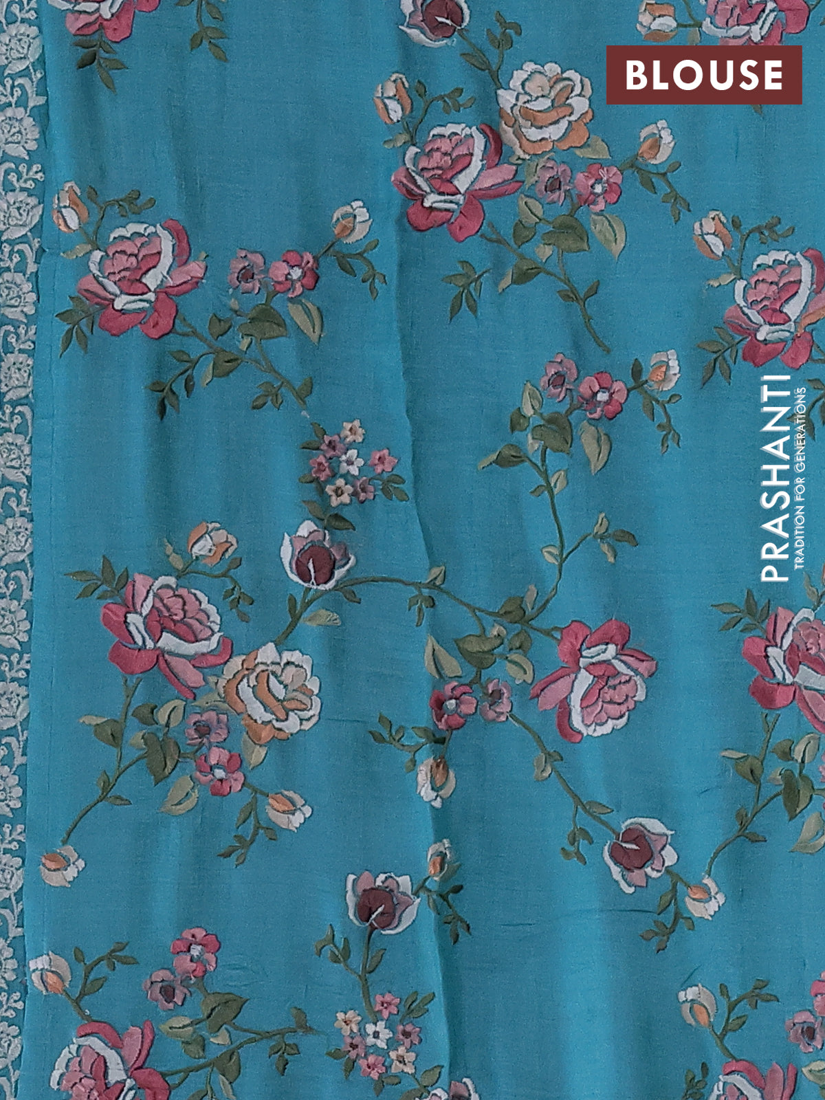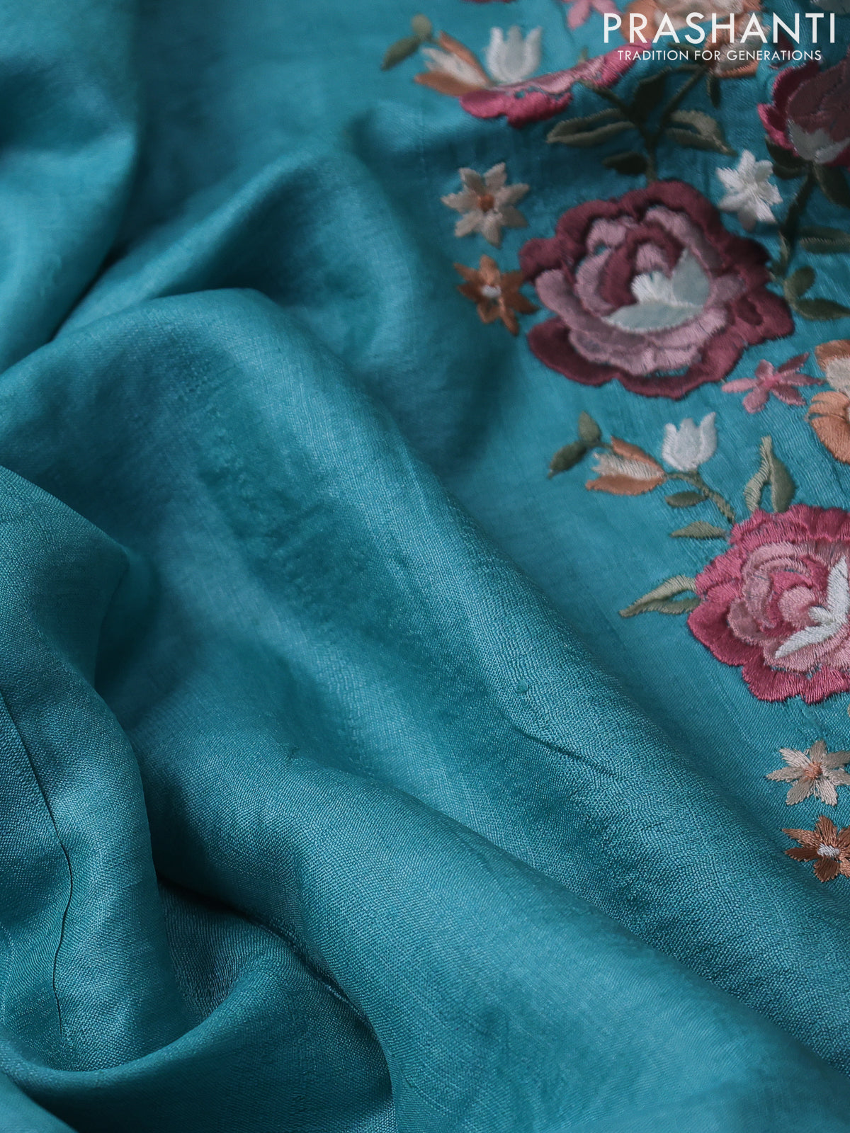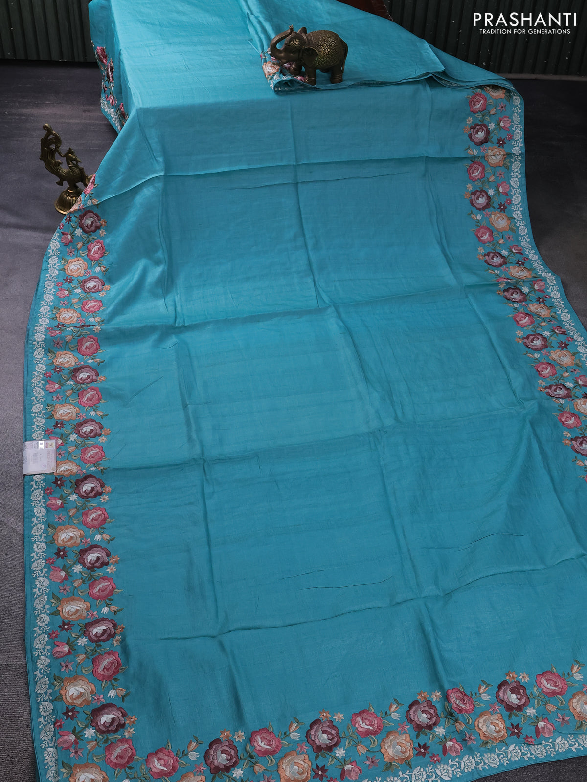 Pure tussar silk saree teal blue with plain body and floral design embroidery work border