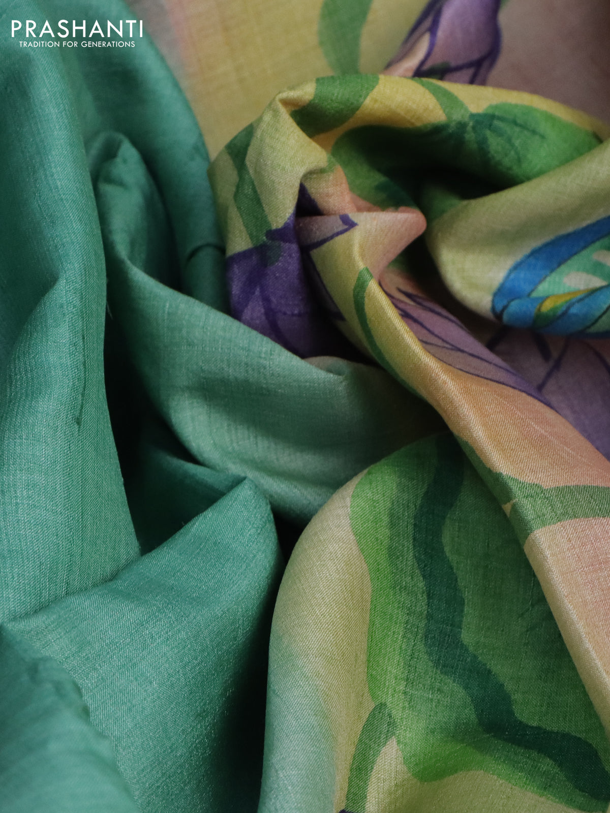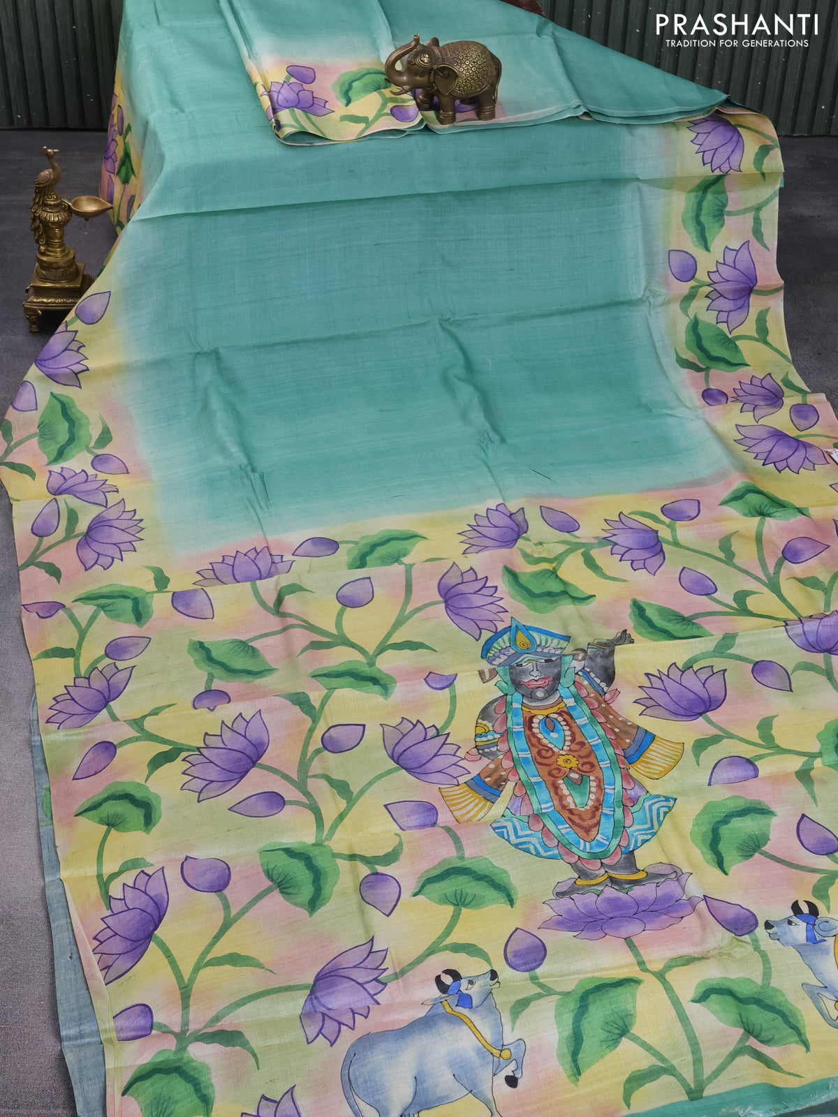 Pure tussar silk saree teal green shade and grey shade with plain body and pichwai hand painted pallu & border