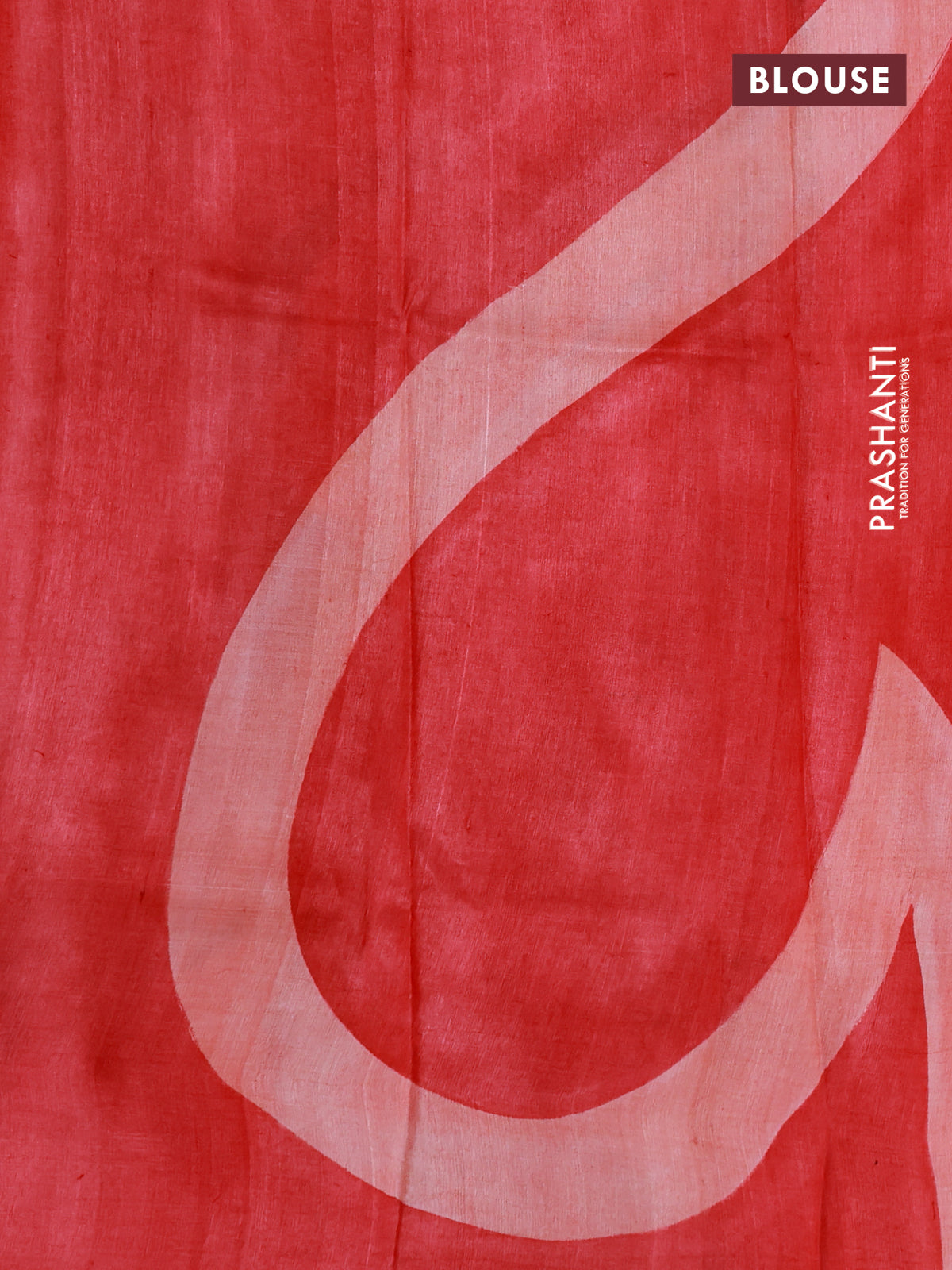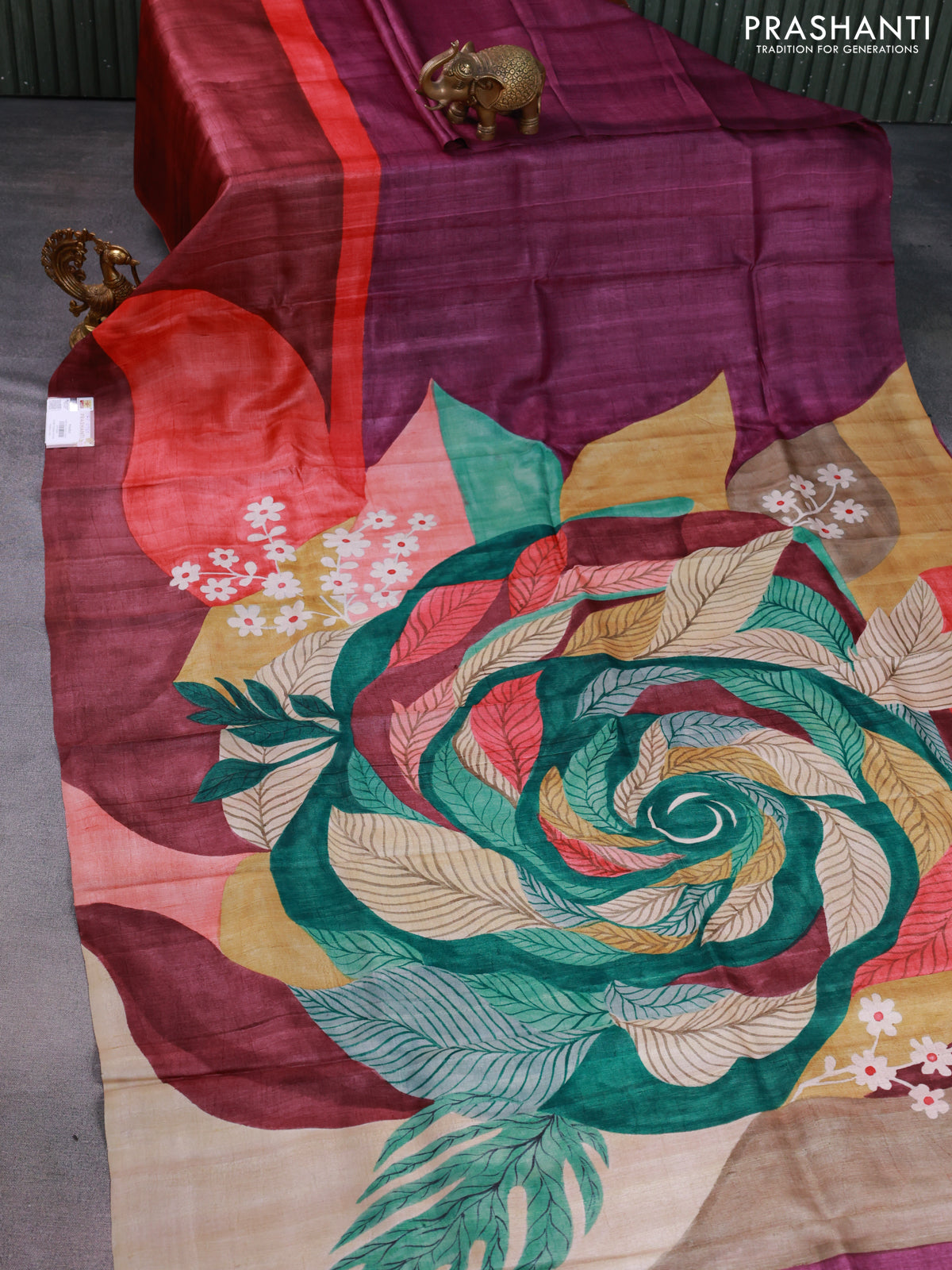 Pure tussar silk saree wine shade and multi colour with hand painted prints in borderless style