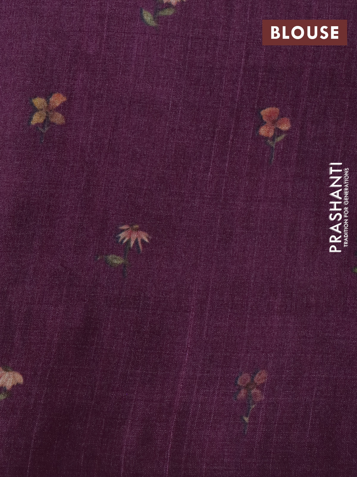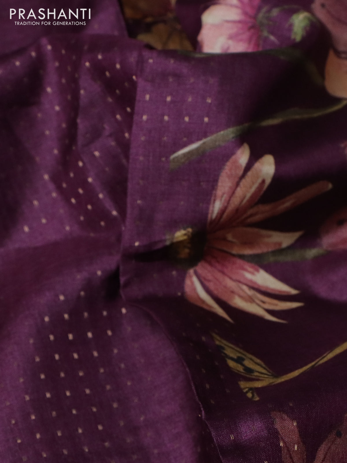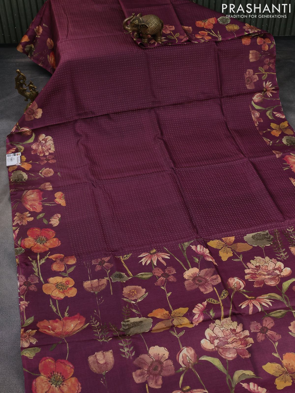 Pure tussar silk saree wine shade with allover zari weaves and floral digital printed border