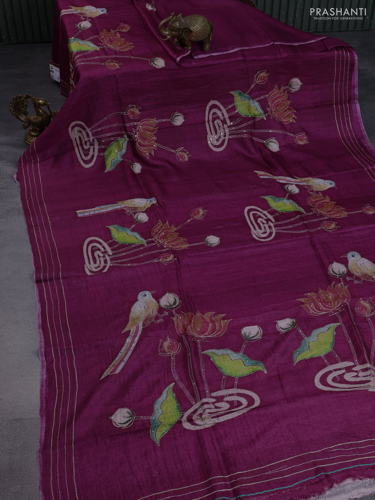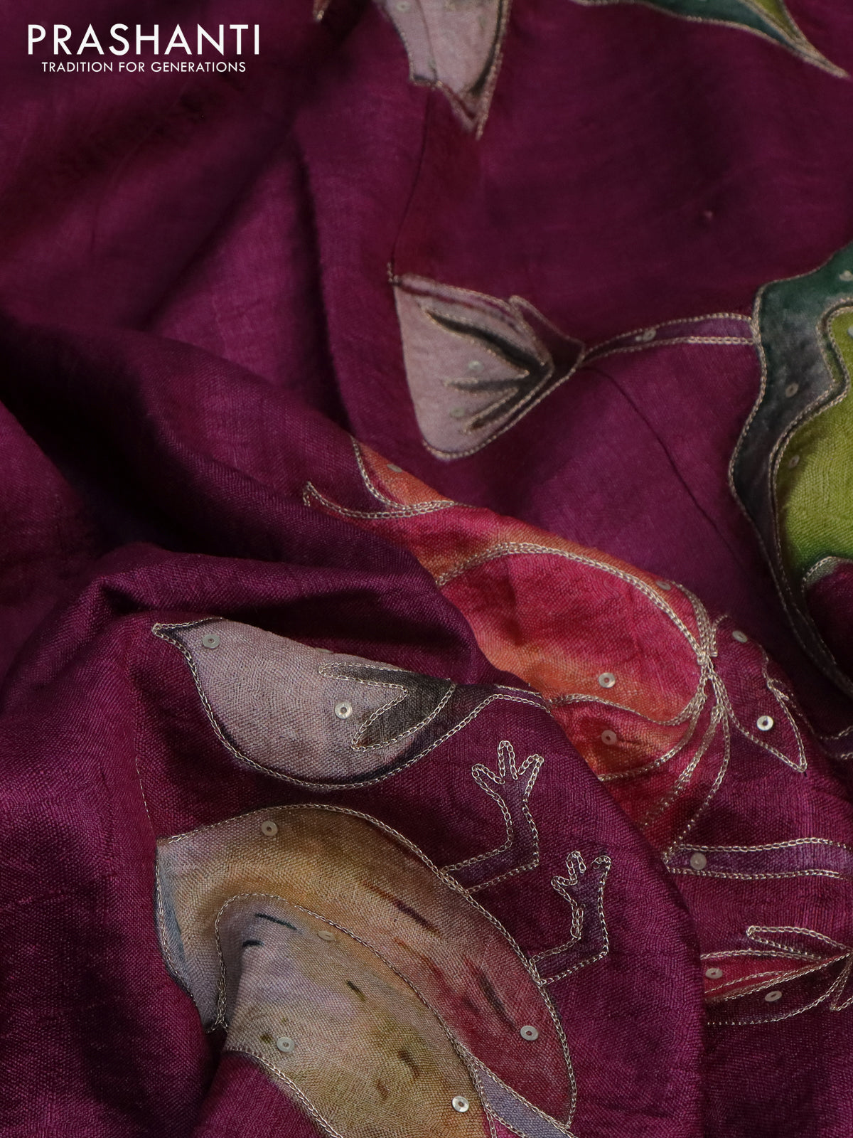 Pure tussar silk saree wine shade with pichwai prints & pita work