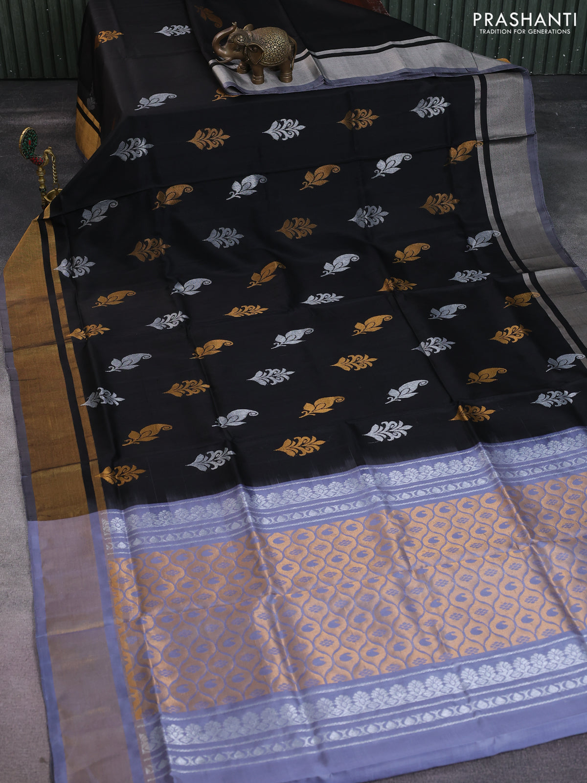 Pure uppada silk saree black and grey with silver & gold zari woven buttas and zari woven border