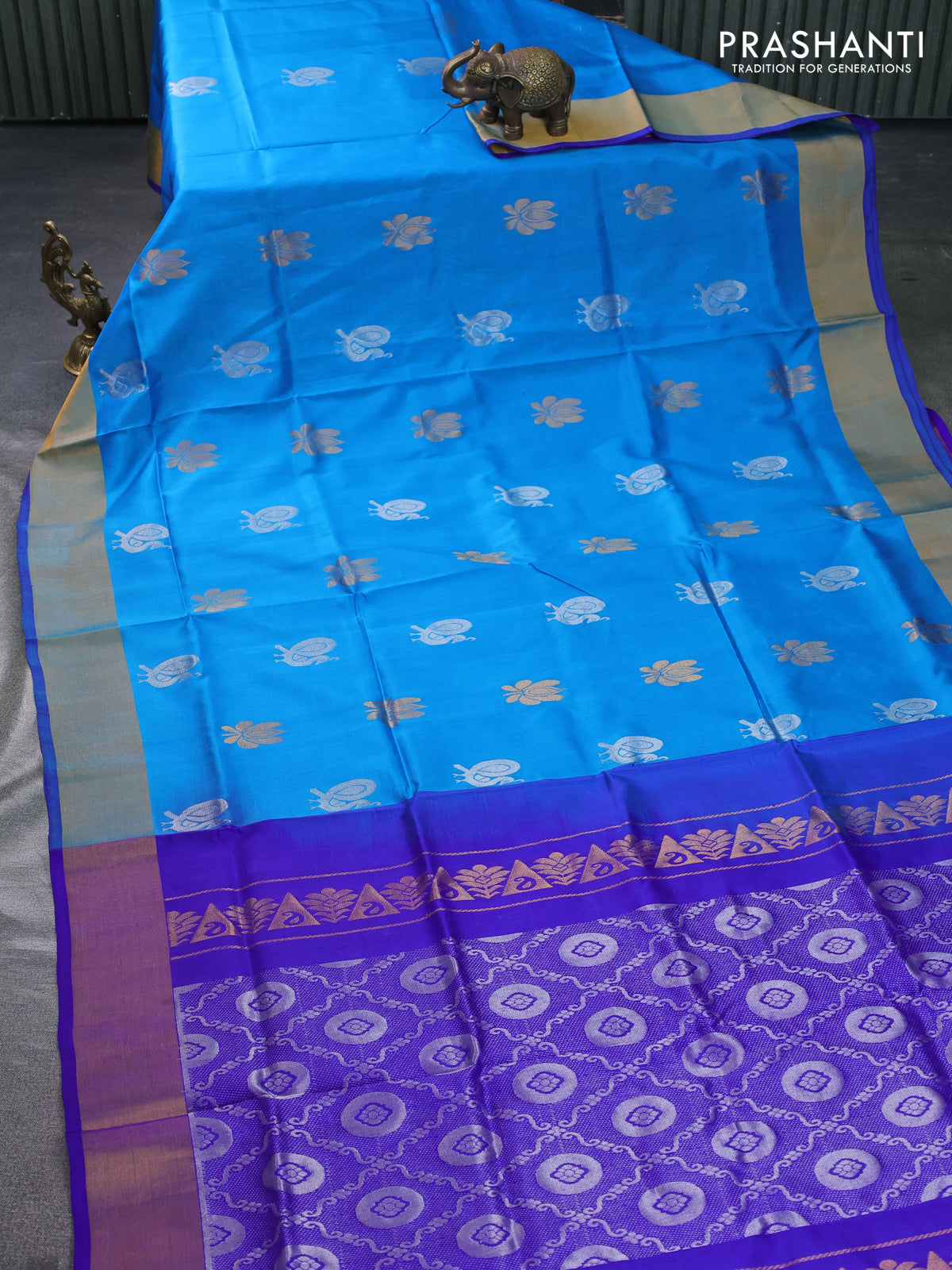 Pure uppada silk saree cs blue and blue with silver & gold zari woven buttas and zari woven border