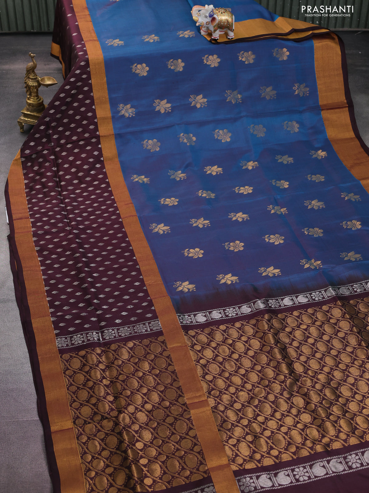 Pure uppada silk saree cs blue and coffee brown with zari woven floral buttas and zari woven butta border