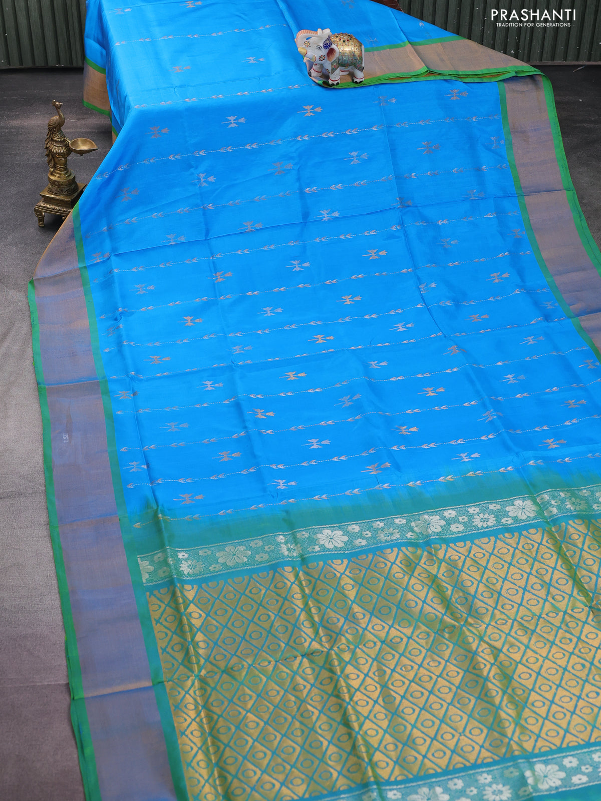 Pure uppada silk saree cs blue and dual shade of green with allover silver & gold zari weaves and zari woven border