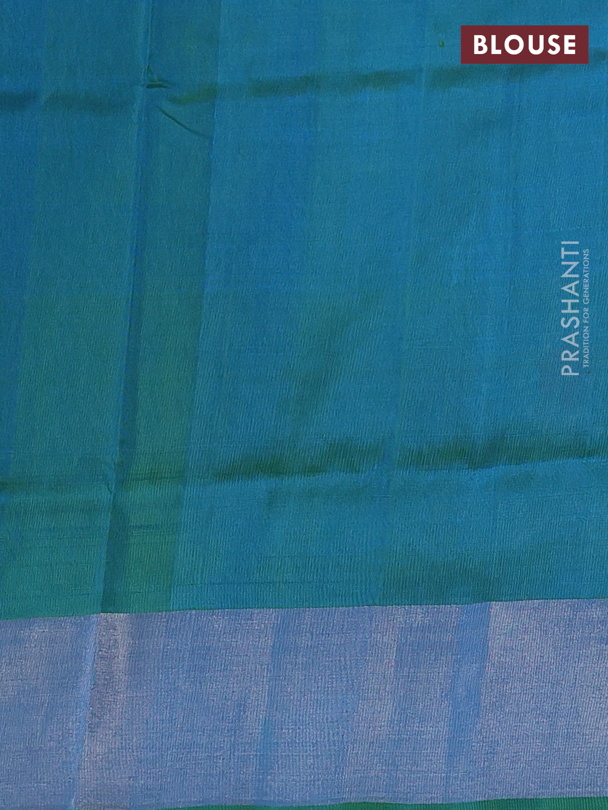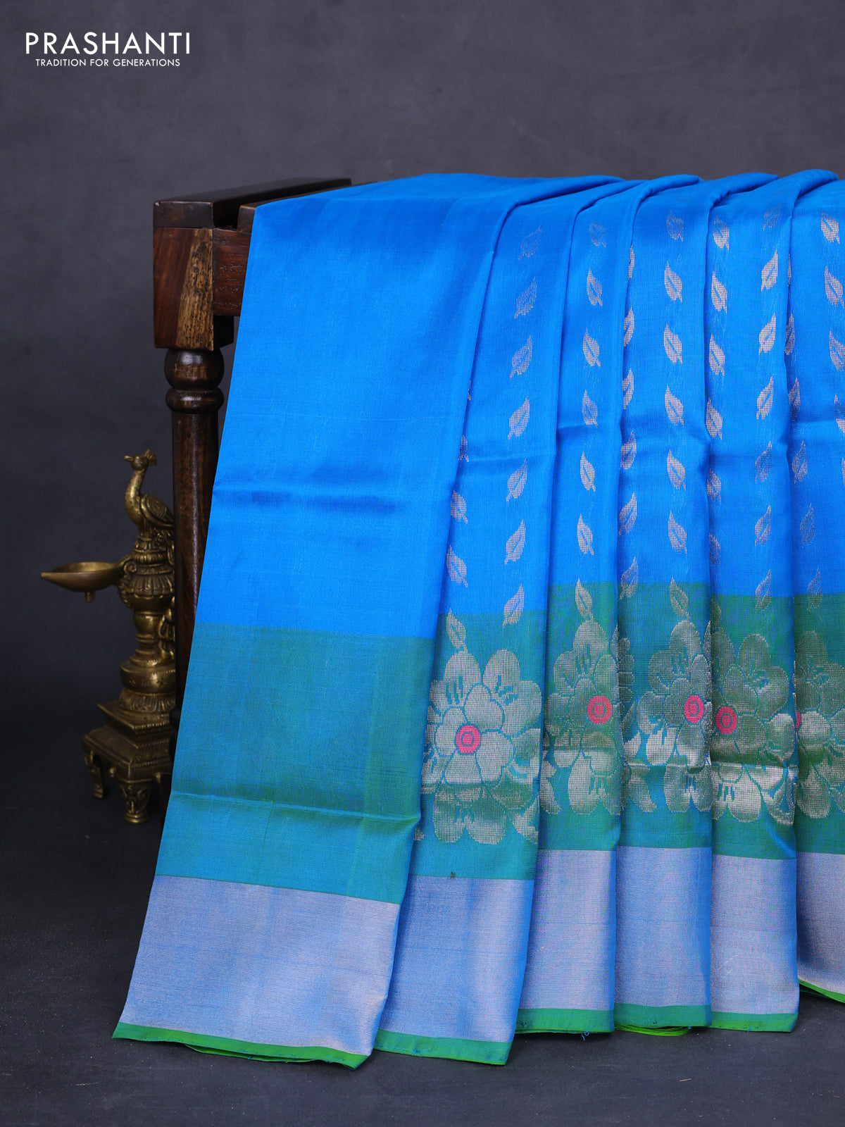 Pure uppada silk saree cs blue and dual shade of green with allover silver zari woven leaf buttas and silver zari woven border