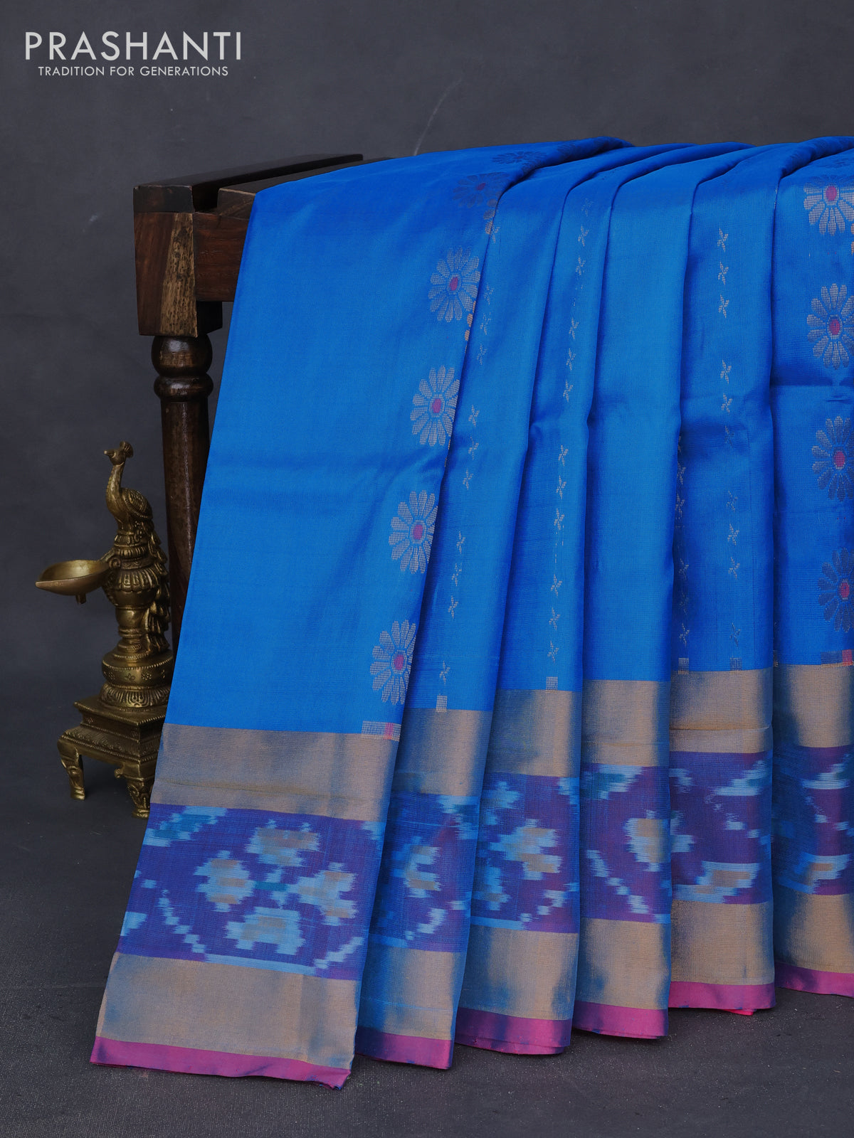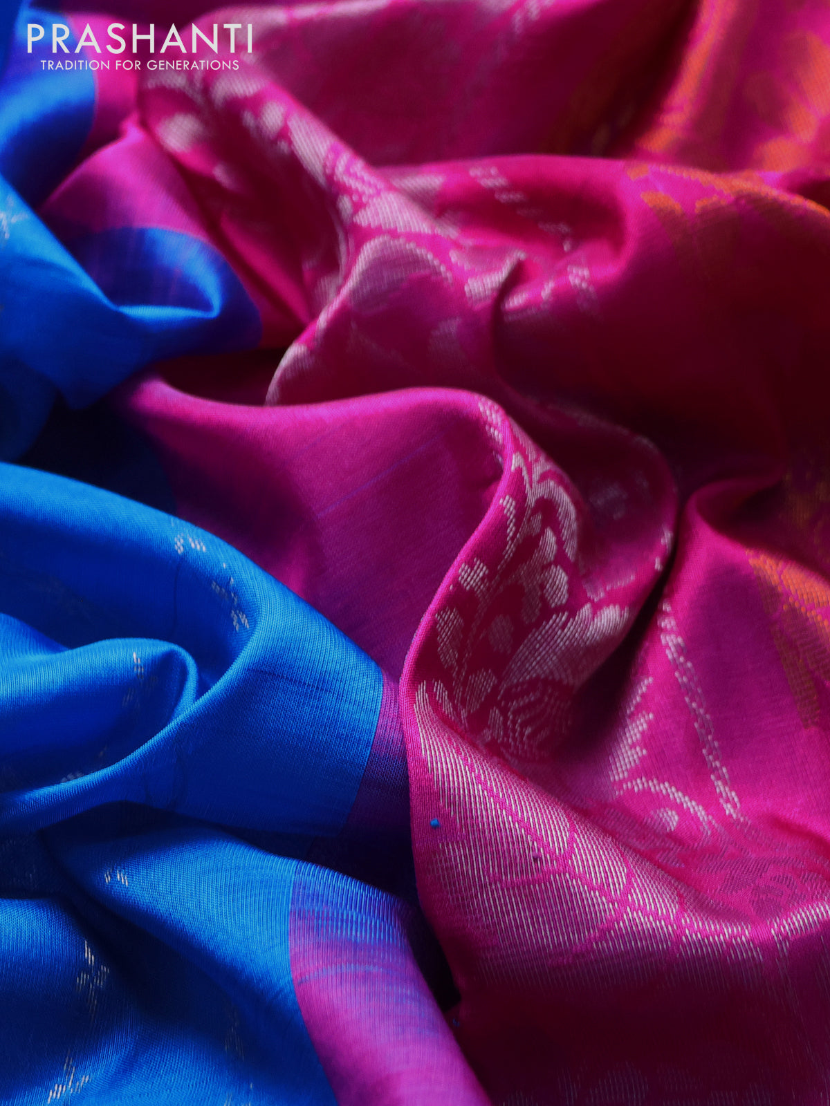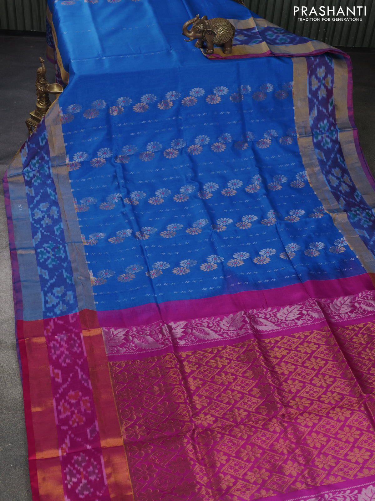 Pure uppada silk saree cs blue and pink with silver & gold zari weaves and zari woven ikat style border