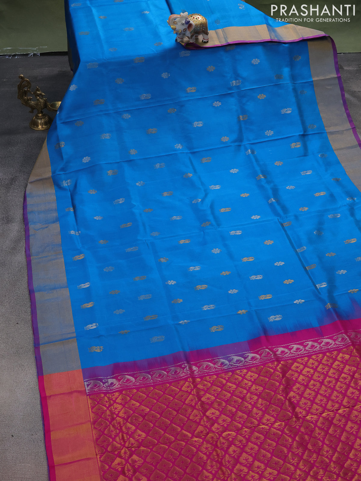 Pure uppada silk saree cs blue and pink with silver & gold zari woven buttas and zari woven border