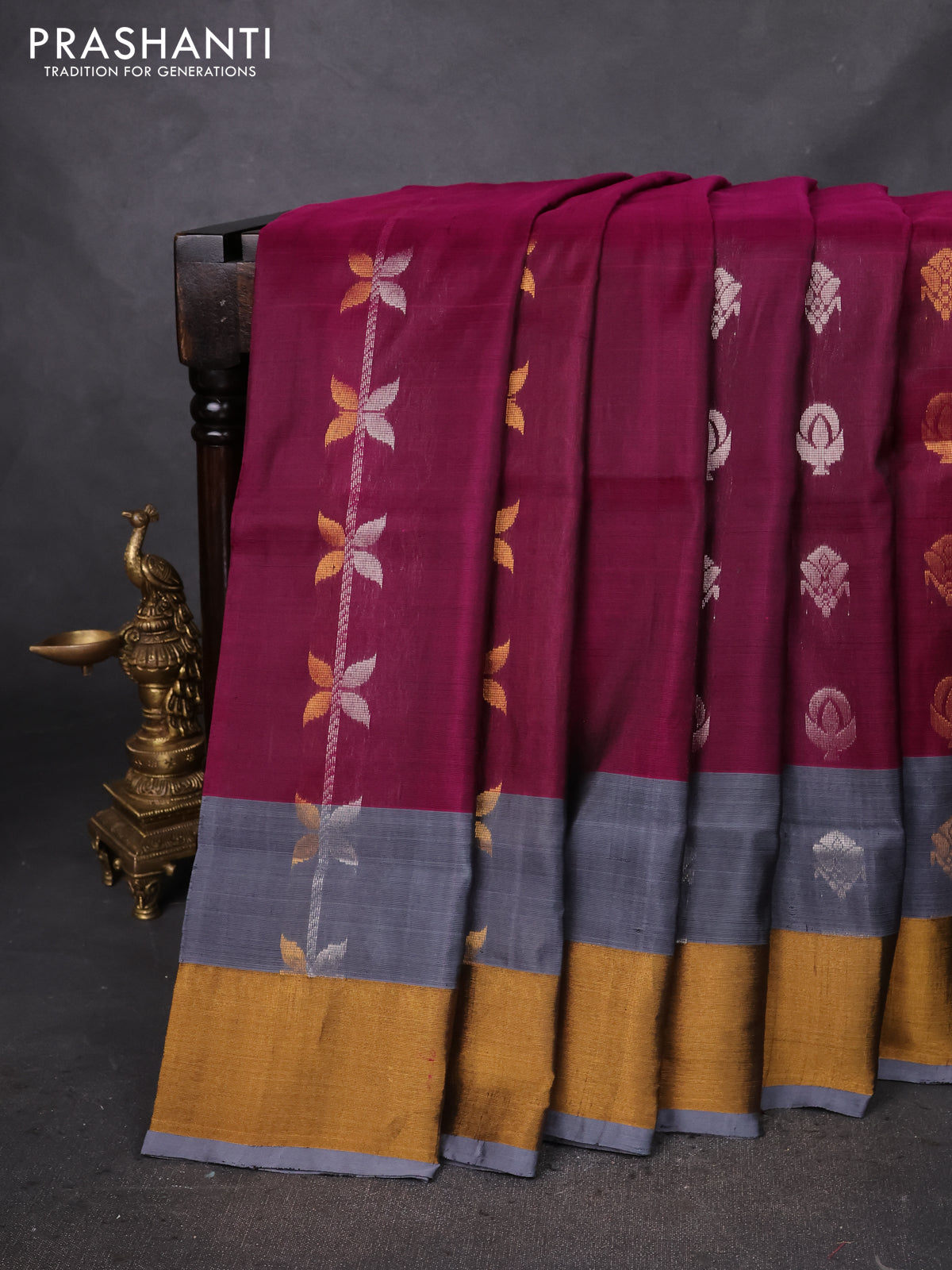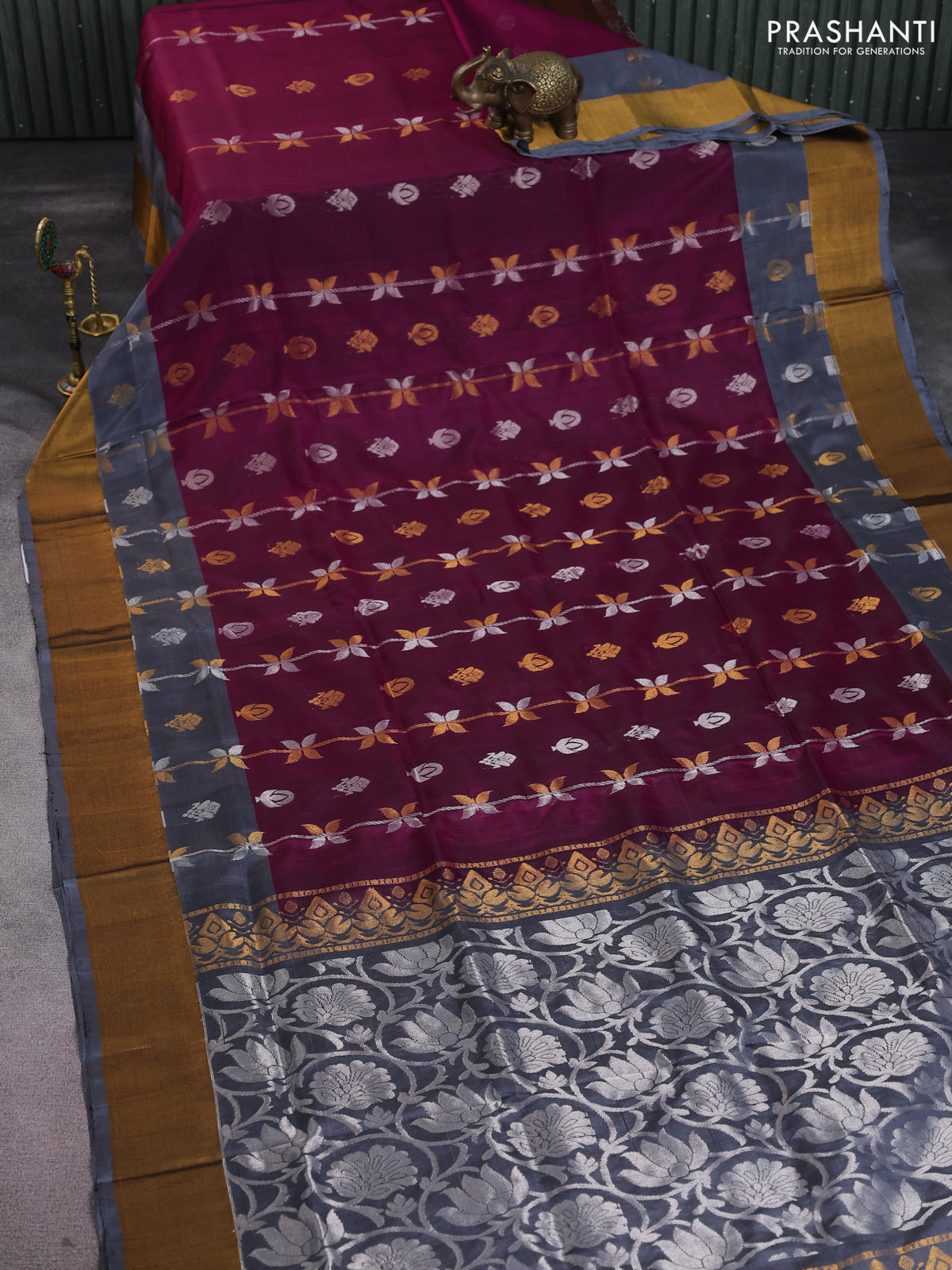 Pure uppada silk saree dark magenta pink and pastel grey with allover silver & gold zari weaves and zari woven border
