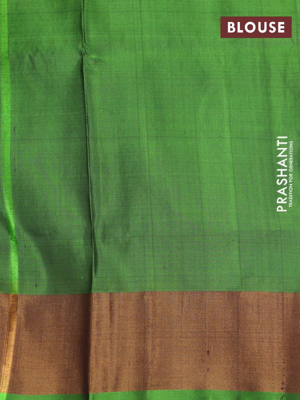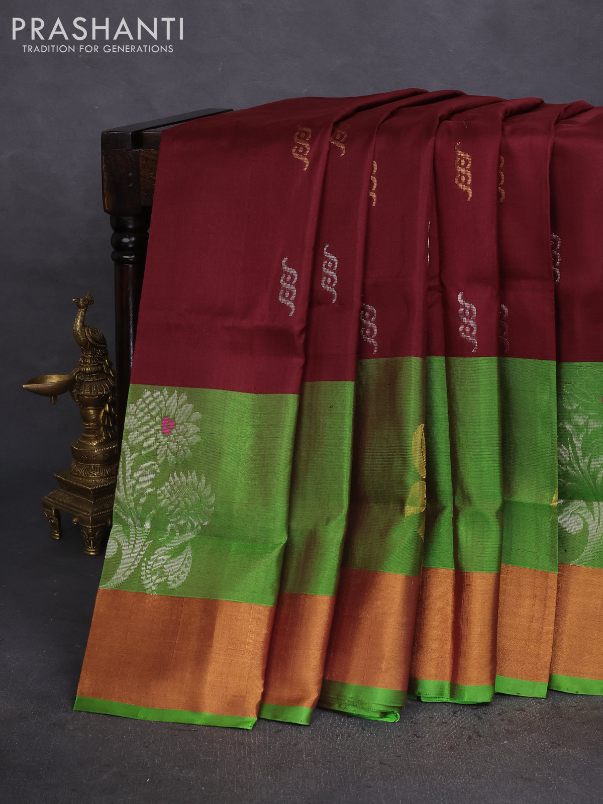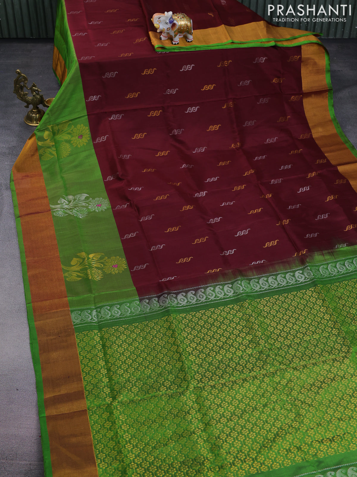 Pure uppada silk saree deep maroon and light green with silver & gold zari woven buttas and long floral zari woven butta border