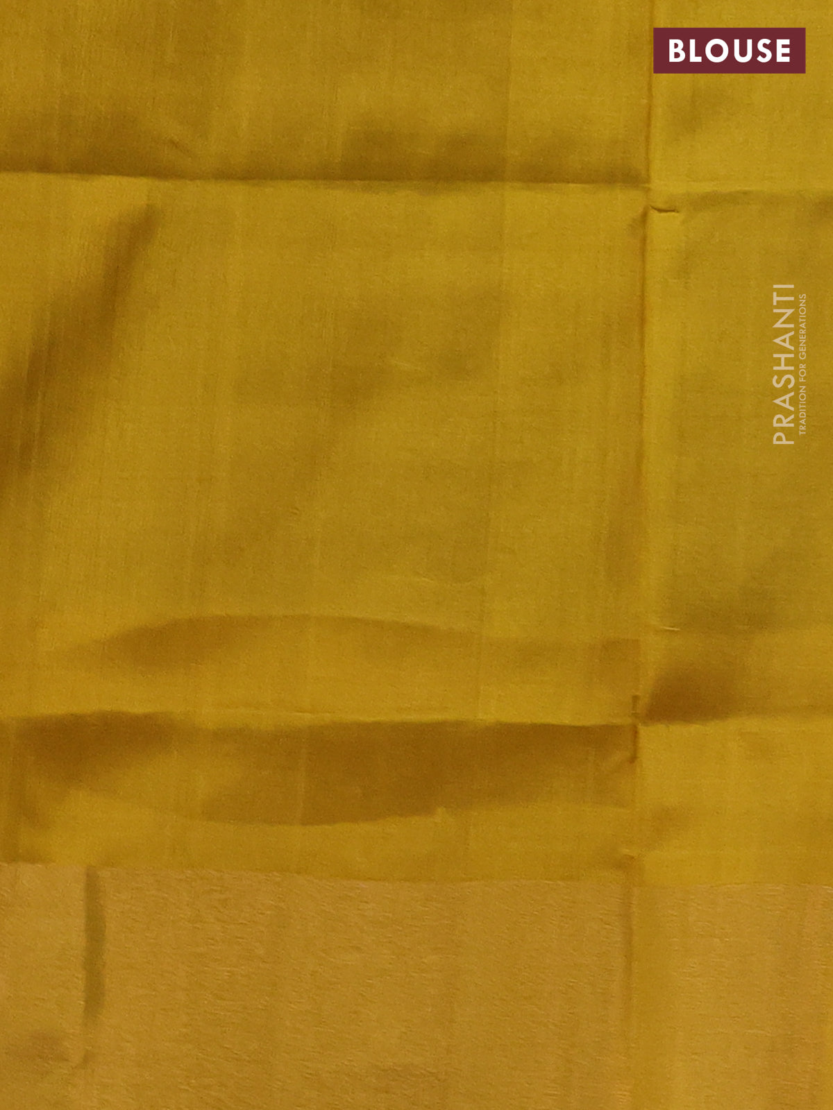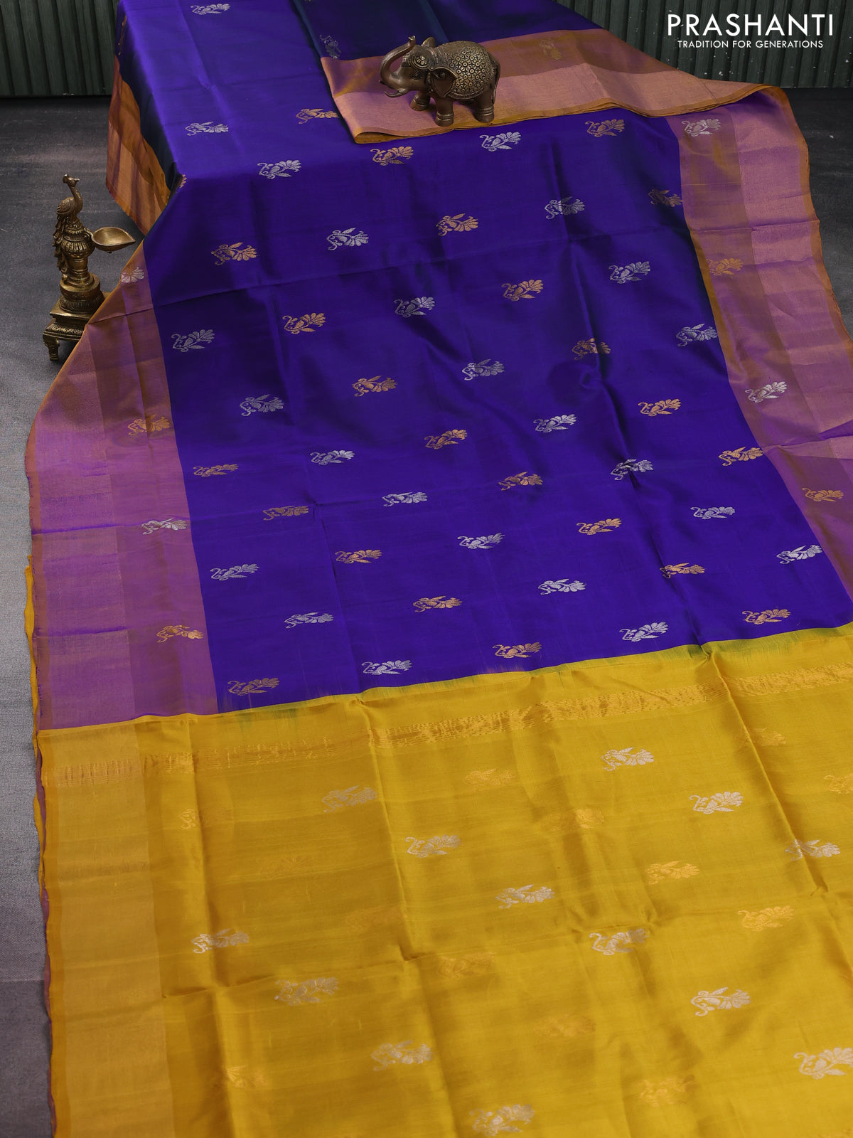 Pure uppada silk saree dual shade of blue and mustard yellow with silver & gold zari woven buttas and zari woven border