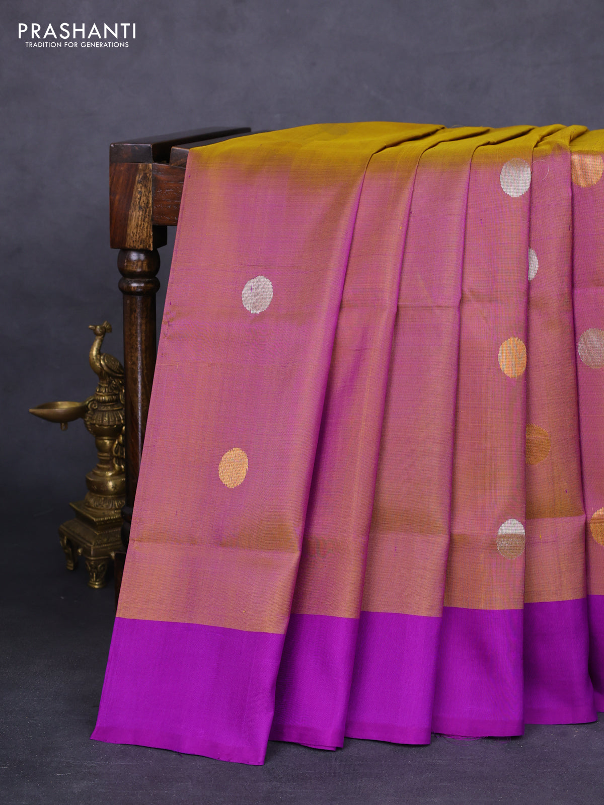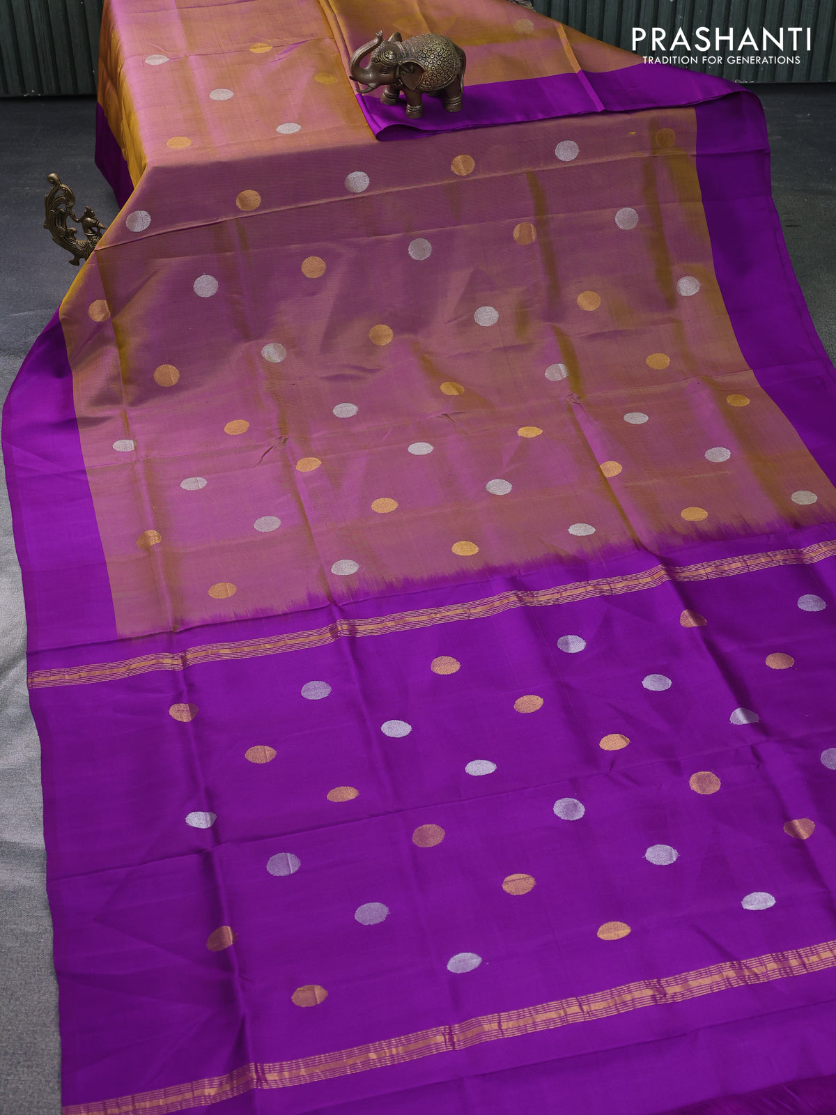 Pure uppada silk saree dual shade of dark mustard and purple with silver & gold zari woven coin buttas and simple border